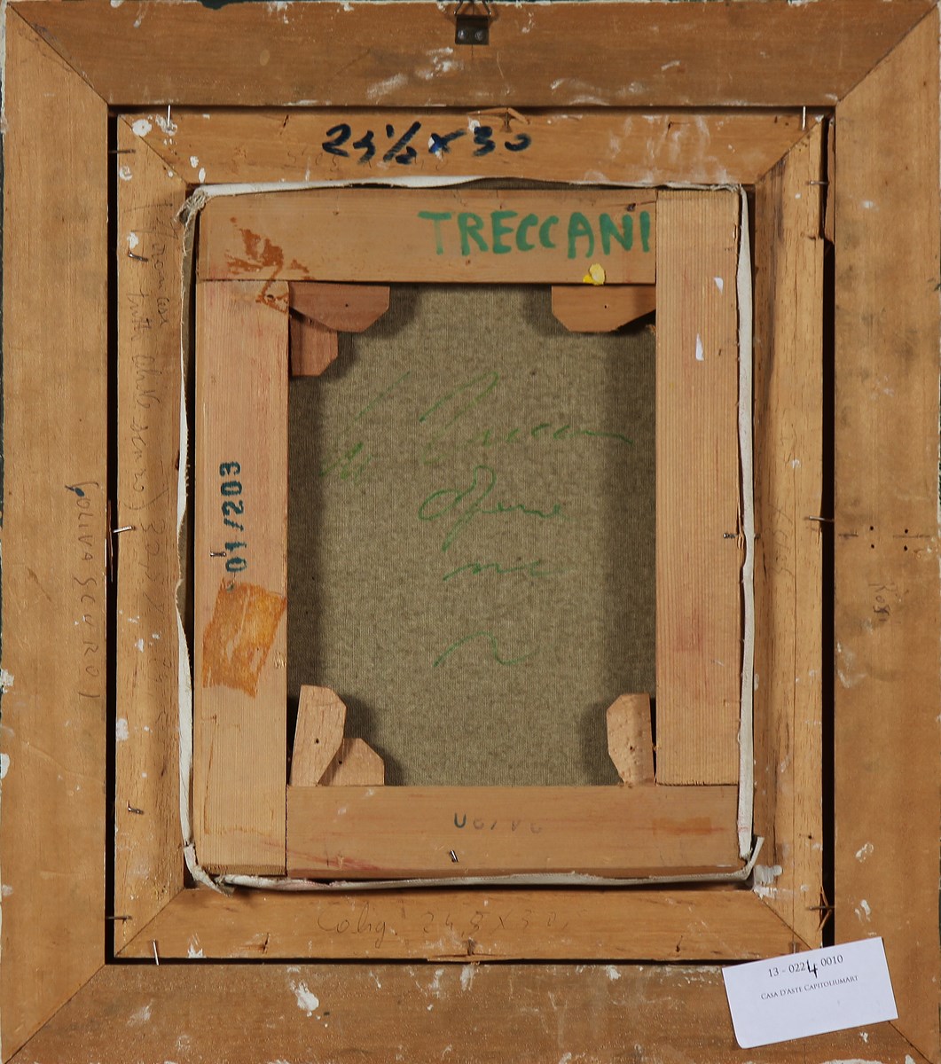 TRECCANI ERNESTO (1920 - 2009) Senza titolo. Olio su tela . Cm 24,00 x 30,00. Firma in basso. Al retro firma. Autentica dell'artista su fotografia. Cornice presente