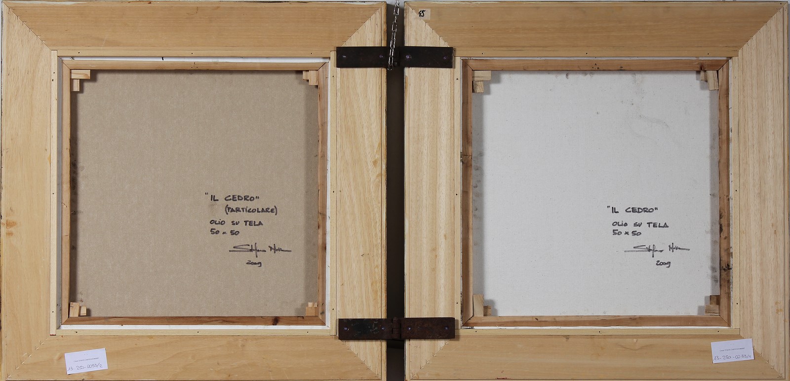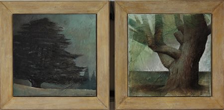NAVA STEFANO (n. 1977) Il cedro. 2009. Olio su tela . Cm 50,00 x 50,00. Dittico. Al retro titolo, firma e data. Misure totali del dittico: 135x66x3 cm. Cornice presente