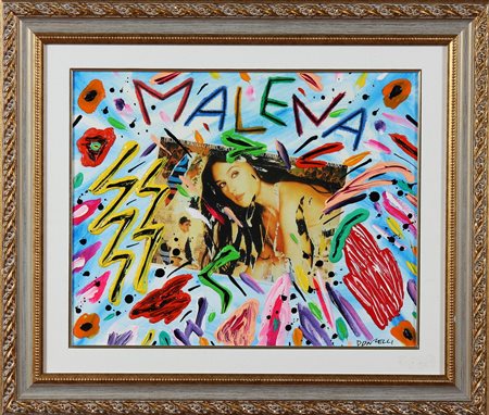 DONZELLI BRUNO (n. 1941) Malena. Tecnica mista su tela. Cm 50,00 x 40,00. Firma in basso a destra. Al retro firma e titolo. Autentica dell'artista su fotografia. Cornice presente