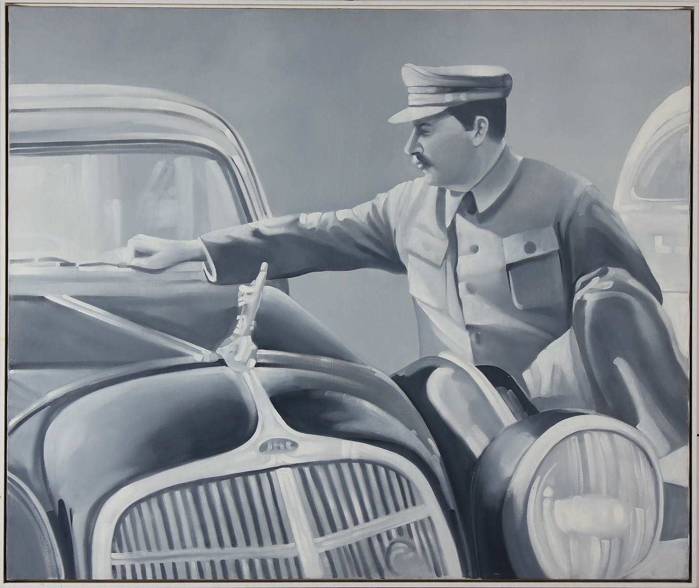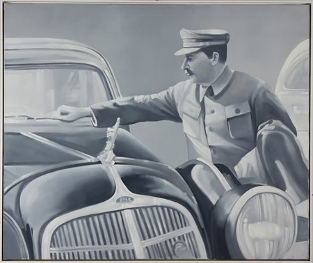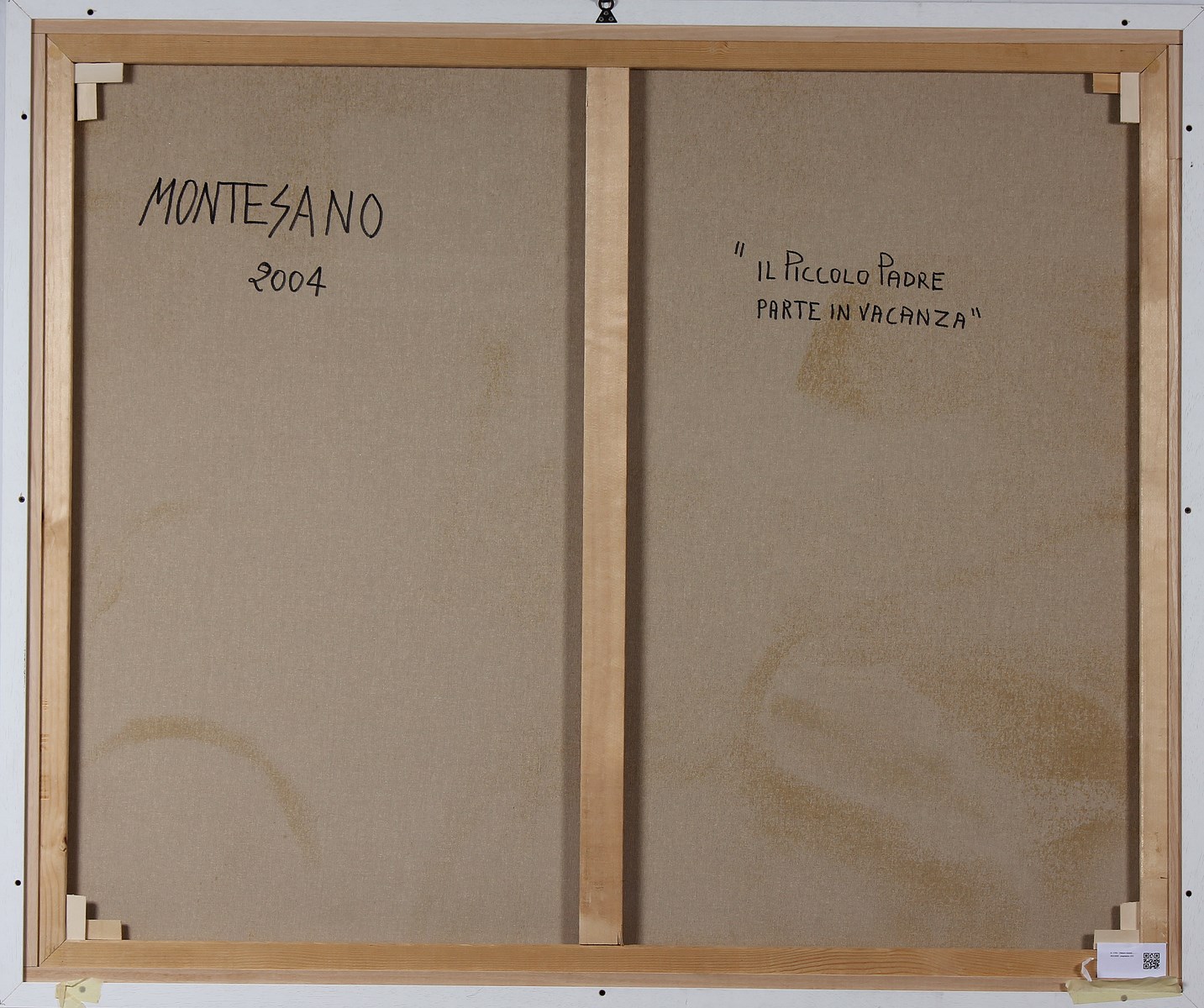 MONTESANO GIAN MARCO (n. 1949) Il piccolo Padre parte in vacanza. 2004. Olio su tela . Cm 122,00 x 102,50 x 3,00. Al retro firma, titolo e data. Autentica dell'artista su fotografia a cura di Andrea arte contemporanea, Vicenza. Cornice presente