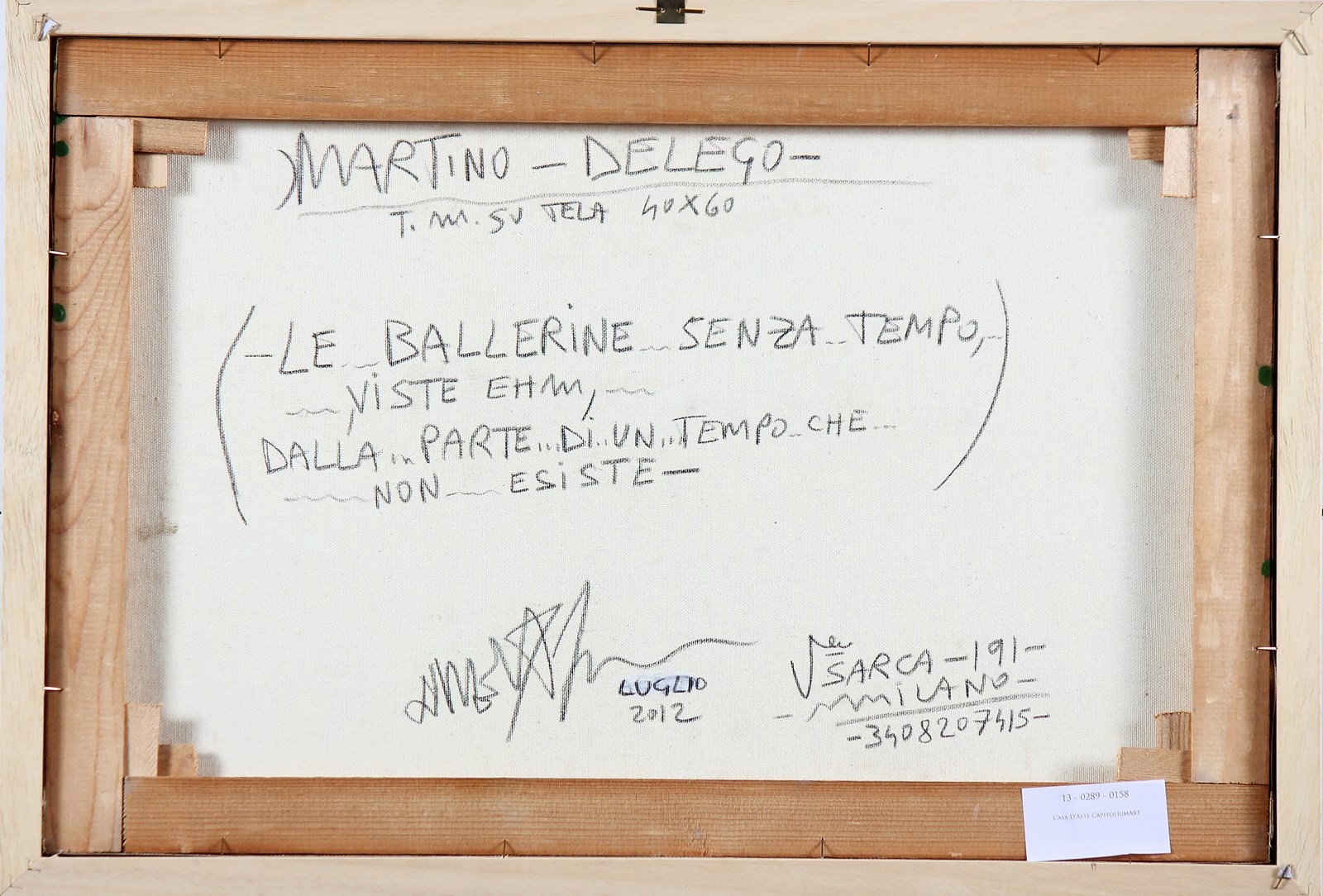 DELEGO MARTINO (n. 1956) Le ballerine senza tempo. 2012. Tecnica mista su tela. Cm 60,00 x 40,00. Firma e data in basso a destra. Al retro firma, data e titolo. Autentica dell'artista su fotografia. Cornice presente