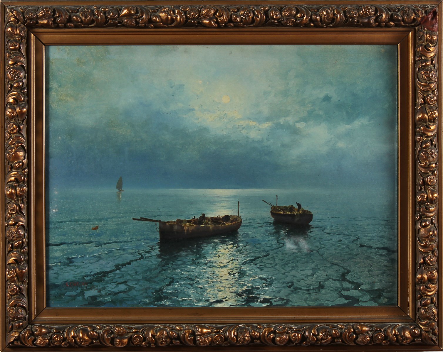 CAVALLERI GIOVANNI (1858 - 1934) Pescatori. 1925. Olio su tela . Cm 80,00 x 60,00. Firma e data in basso a sinistra. Cornice presente