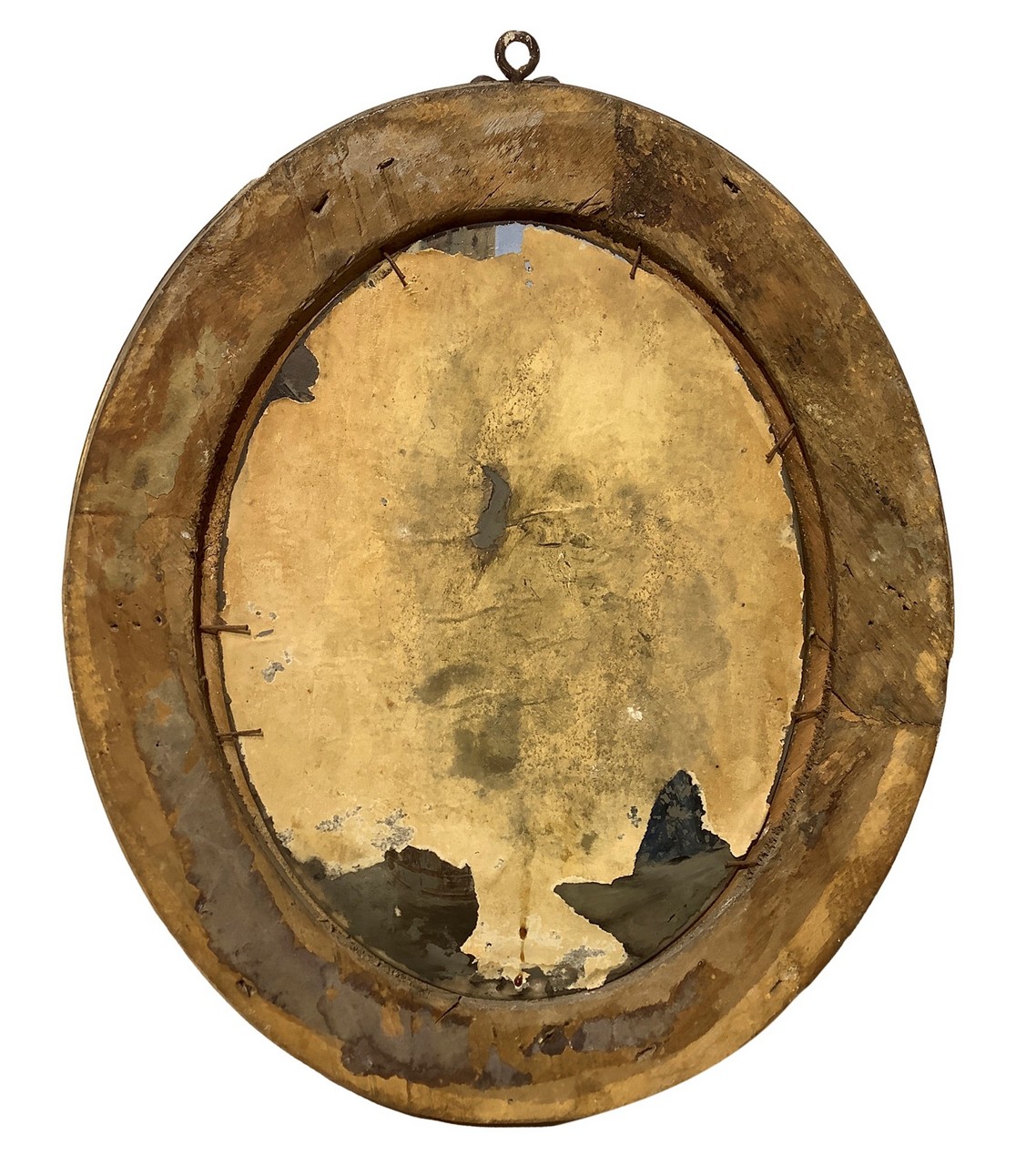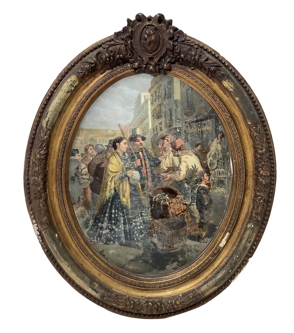 Ovale raffigurante scene di mercato popolare, 19° Secolo h cm 37x32 Pittura su vetro Mancanze di colore.
