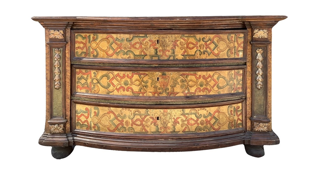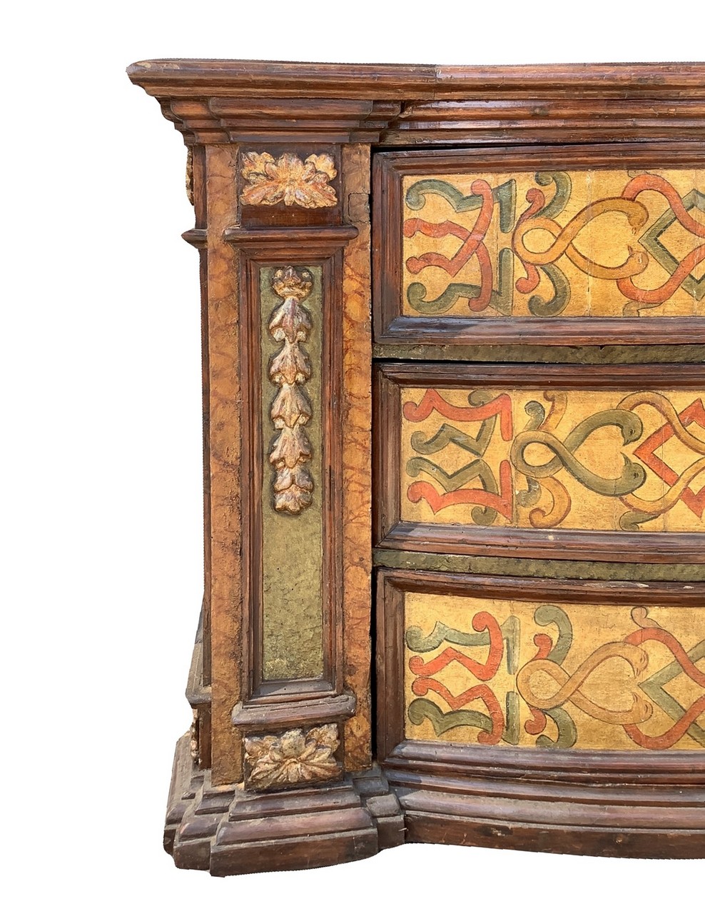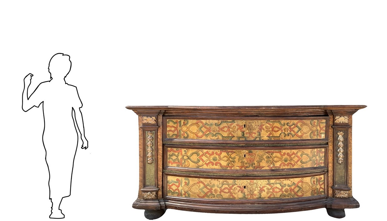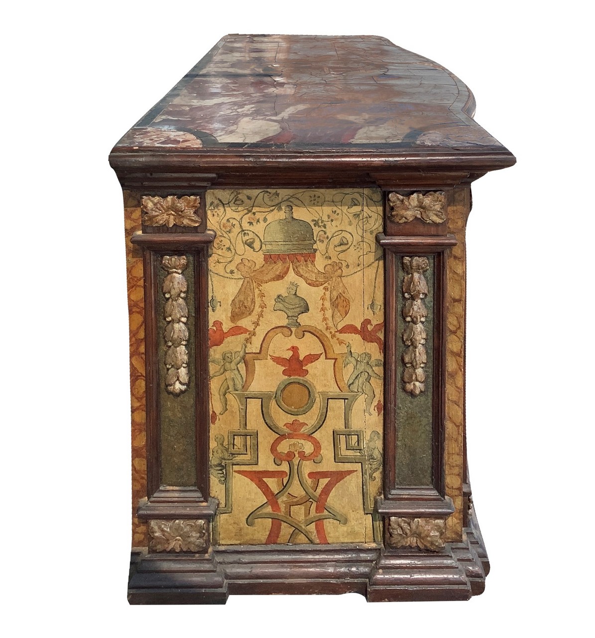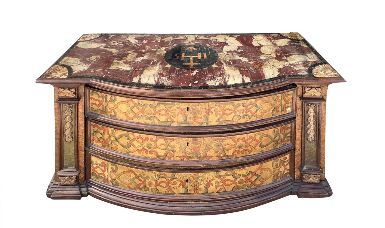 Mobile sacrestia Luigi XIV, laccato e dorato., Fine 17° / 18° Secolo h cm. 110 x 192 x 87 Piano lastronato con commessi di marmi nei toni del rosso. Laccatura policroma su fronte dei cassetti con motivi ornati e richiami di carattere religioso.