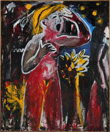 CARRIERI CLAUDIO Senza titolo. 1987. Olio su tela . Cm 99,00 x 119,00. Al retro frima e data. Tela tagliata in centro ed in basso a destra. Cornice presente