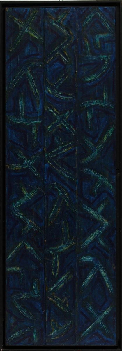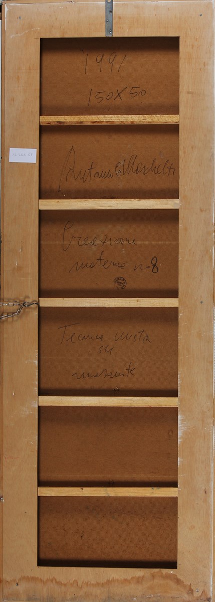 MARCHETTI LAMERA ANTONIO (n. 1964) Creazione materie n.8. 1991. Tecnica mista su masonite. Cm 50,00 x 150,00. Al retro firma, titolo e data. Cornice presente