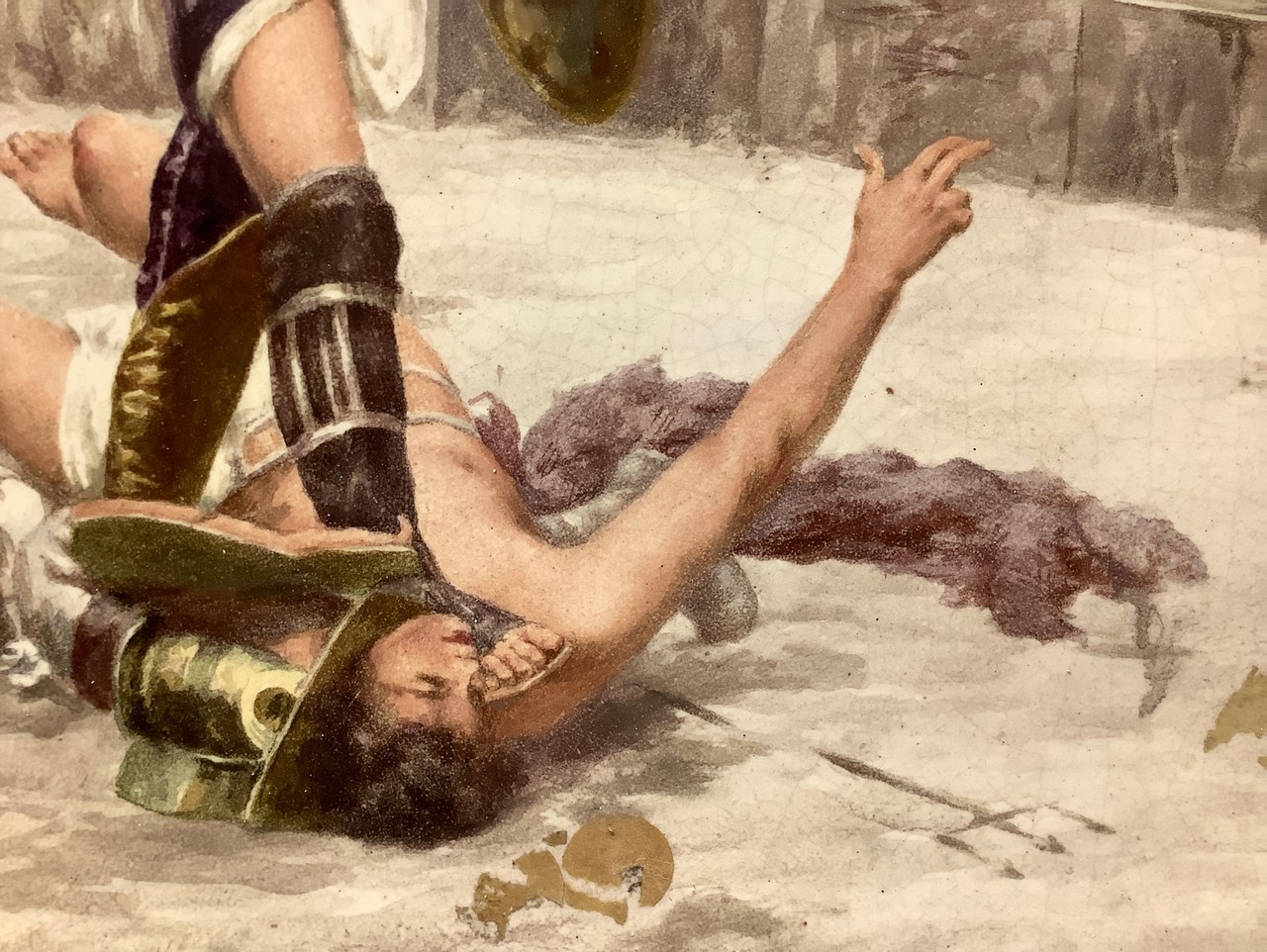 Pasquale Cappelli (Napoli 26 agosto 1866) - Grande piatto Con dipinto raffigurante scena di lotta di Gladiatori in anfiteatro, Fine 19° Secolo