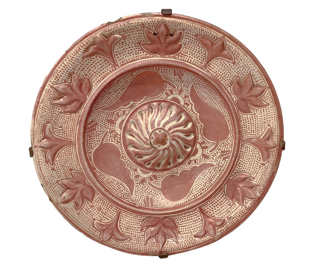 Grande piatto in ceramica ispano moresco dipinto a lustro con motivi a larghe foglie e a unbone sul davanti e sul retro , XVI Secolo