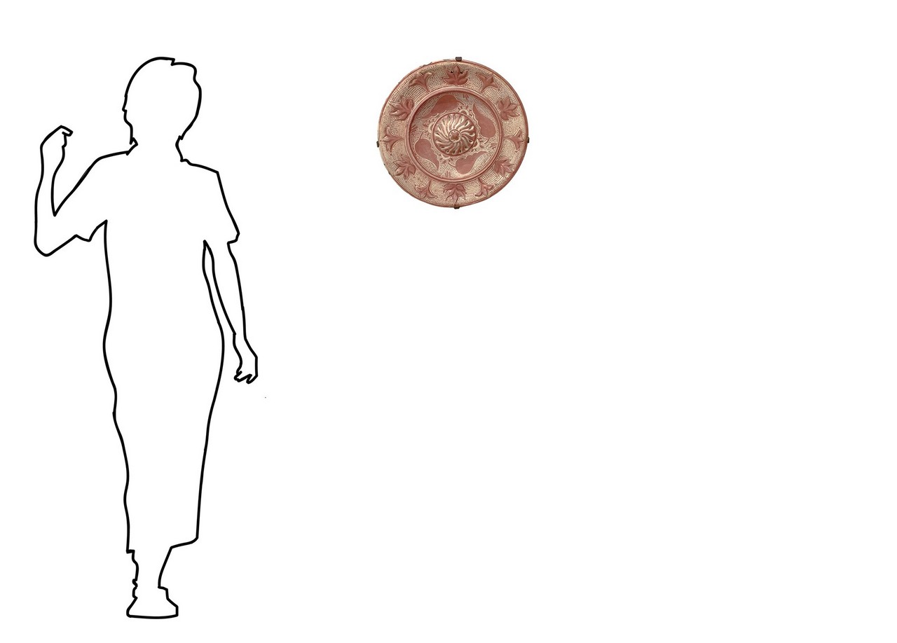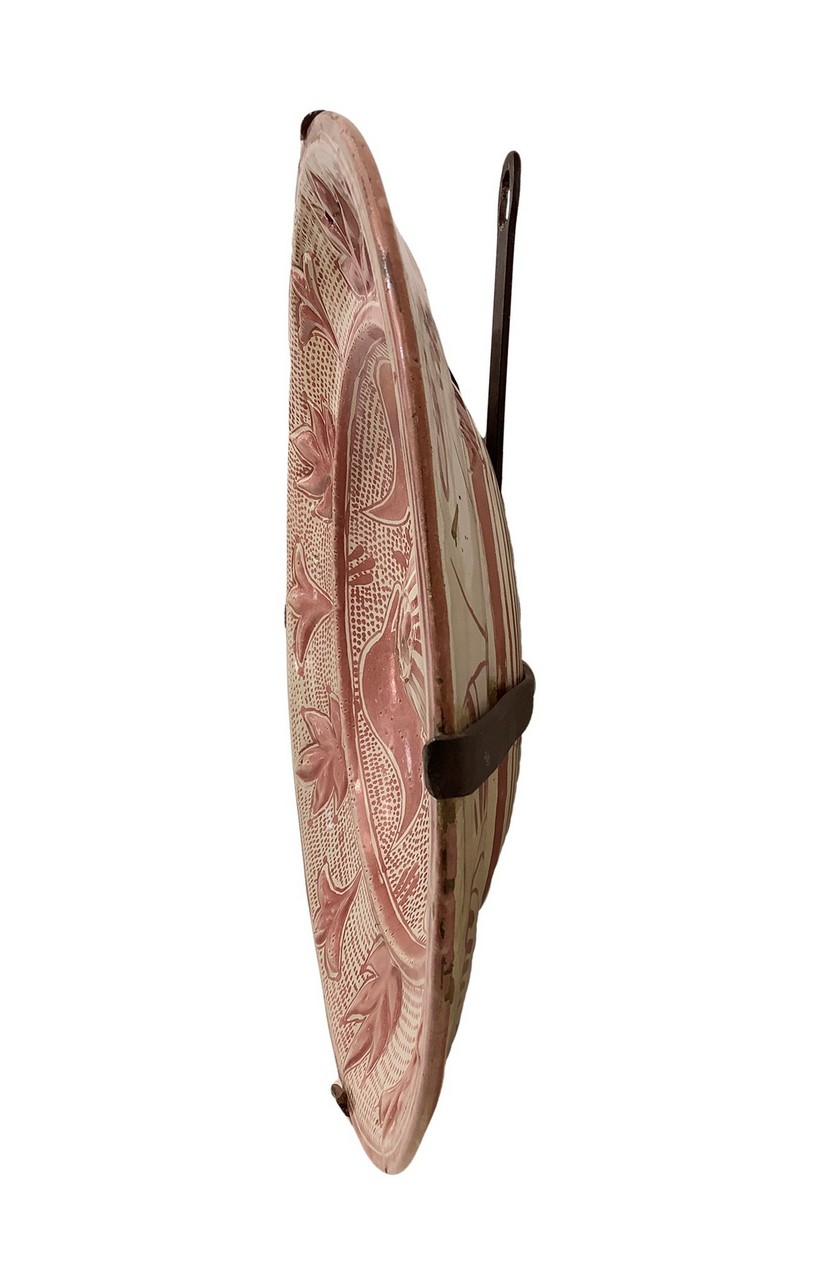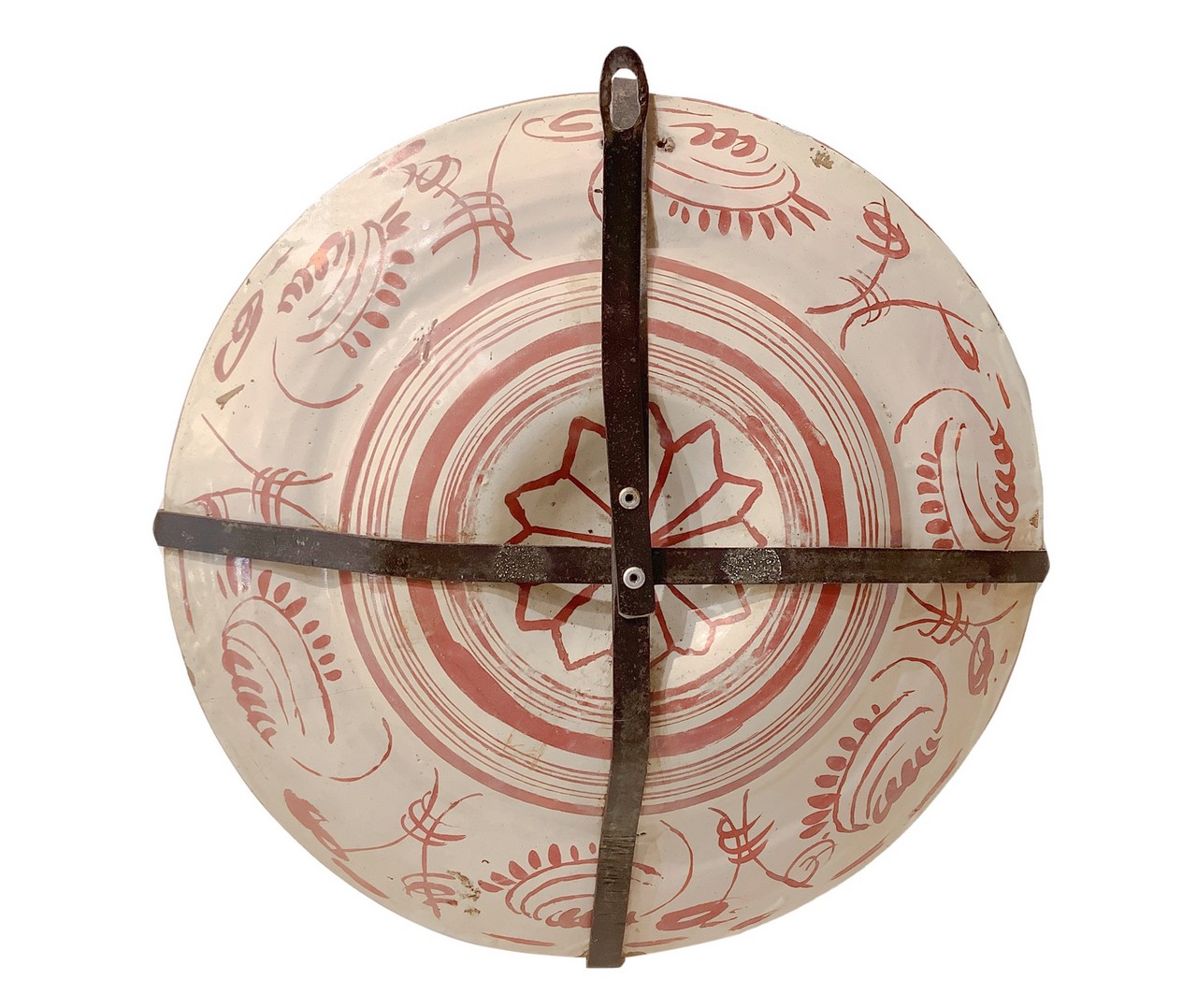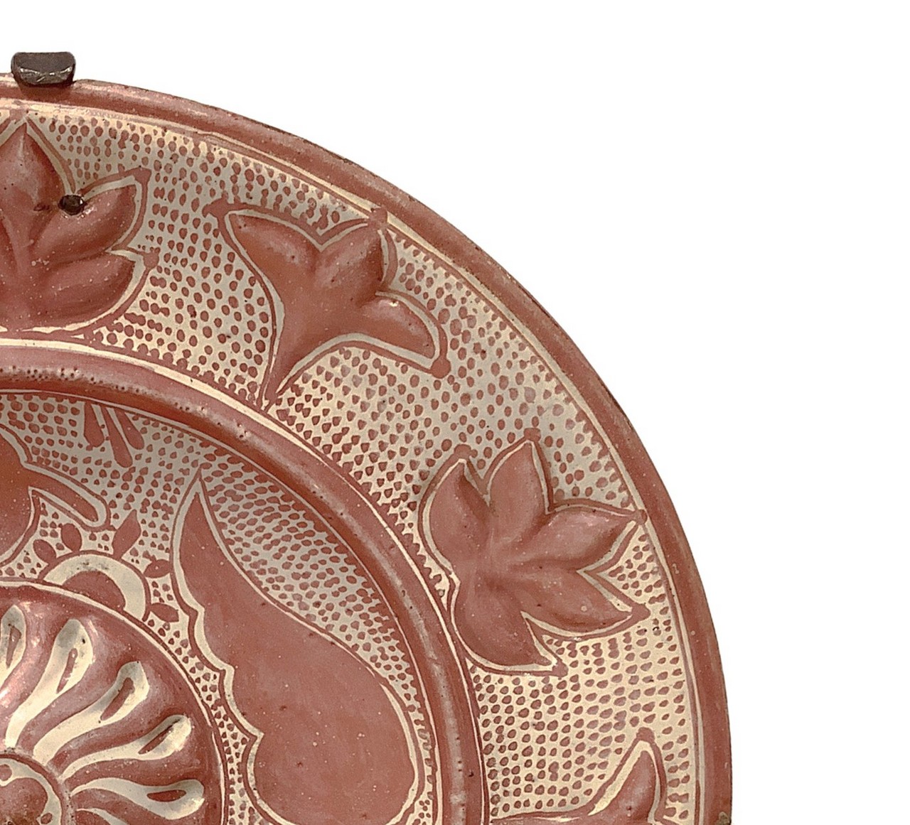 Grande piatto in ceramica ispano moresco dipinto a lustro con motivi a larghe foglie e a unbone sul davanti e sul retro , XVI Secolo diametro 42 cm