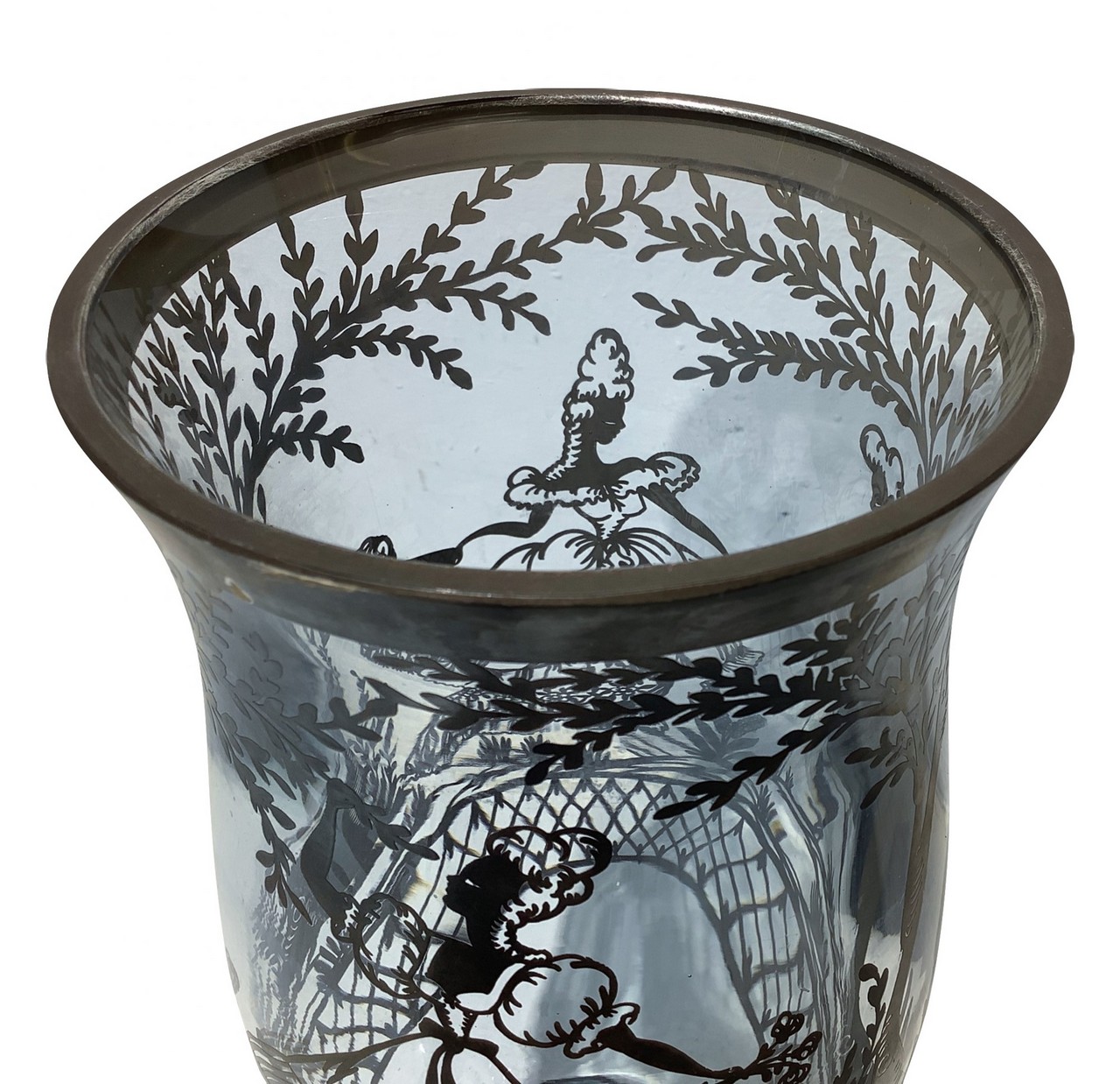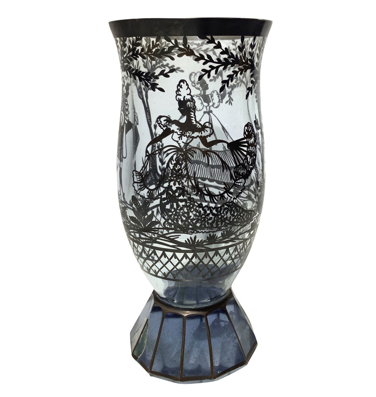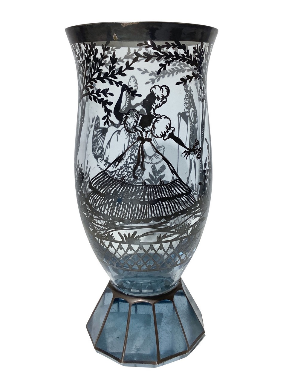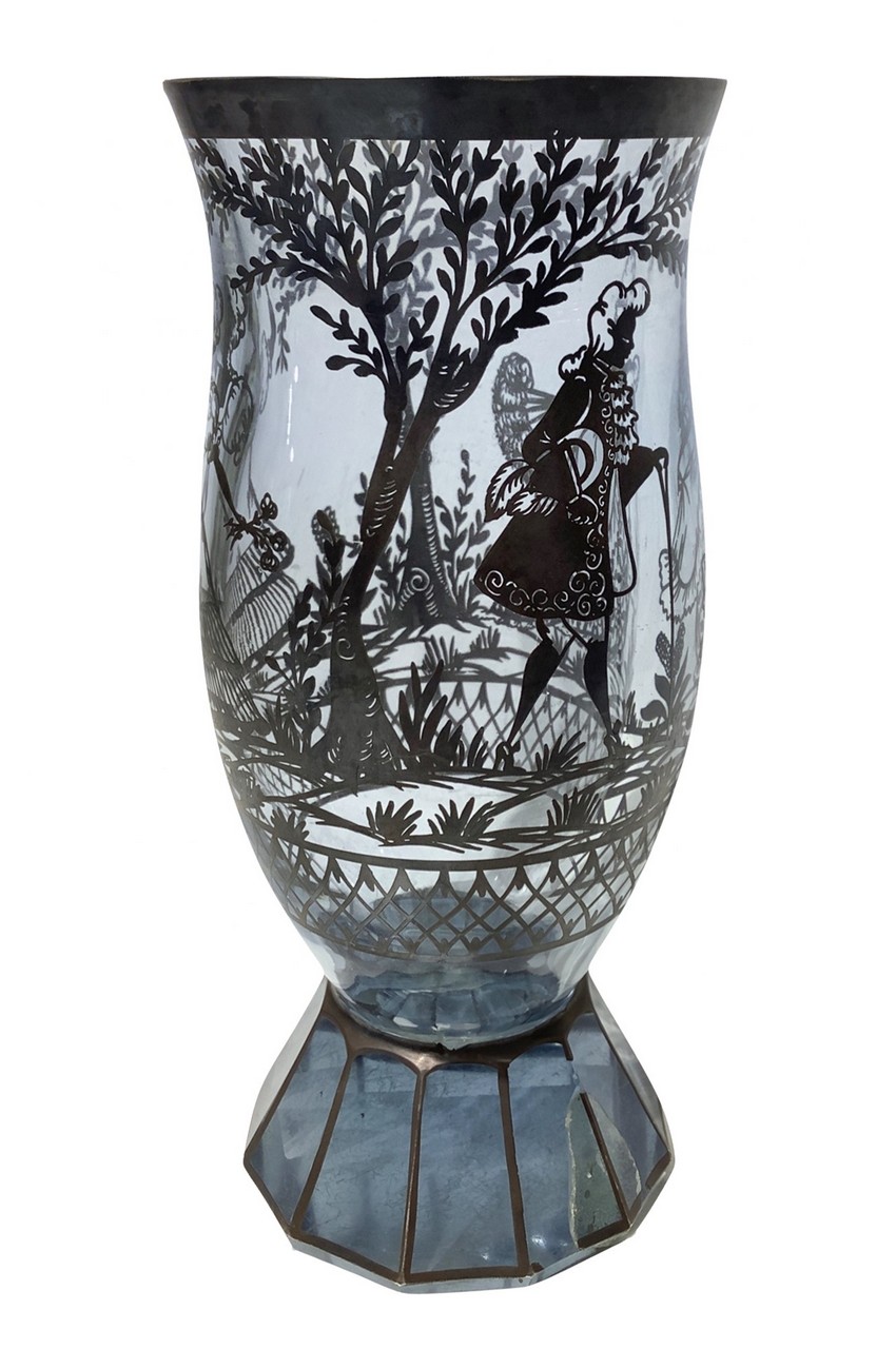 Vaso in vetro pesante con decori in argento con scene di genere galante, Inizi 20° Secolo