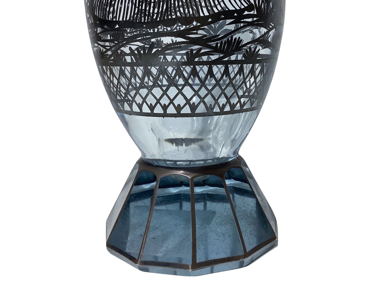 Vaso in vetro pesante con decori in argento con scene di genere galante, Inizi 20° Secolo cm. 26 x 12 Vetro