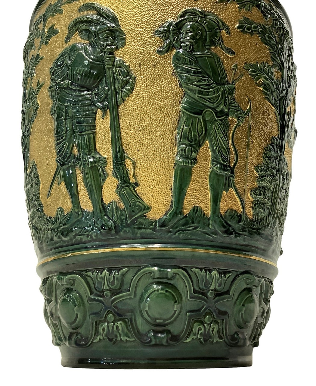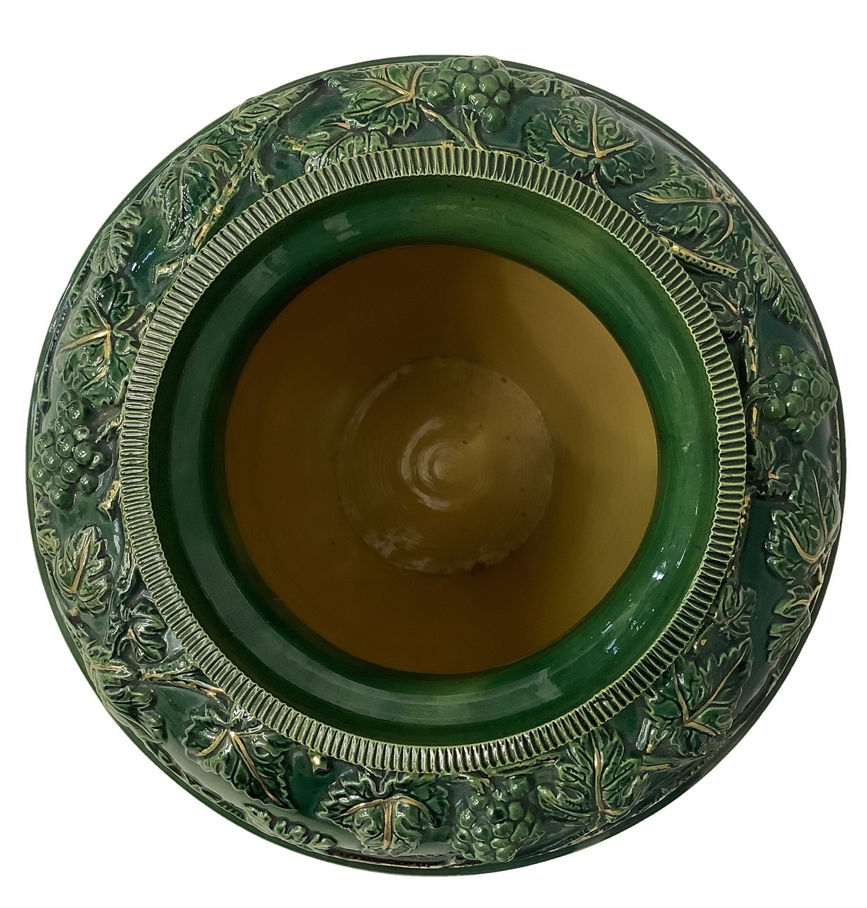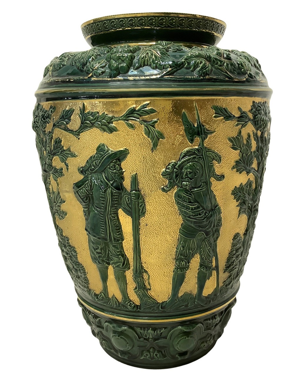 Vaso in maiolica verde e oro con raffigurazione di tralci d'uva e personaggi, 20° Secolo h cm 38; diametro cm 27
