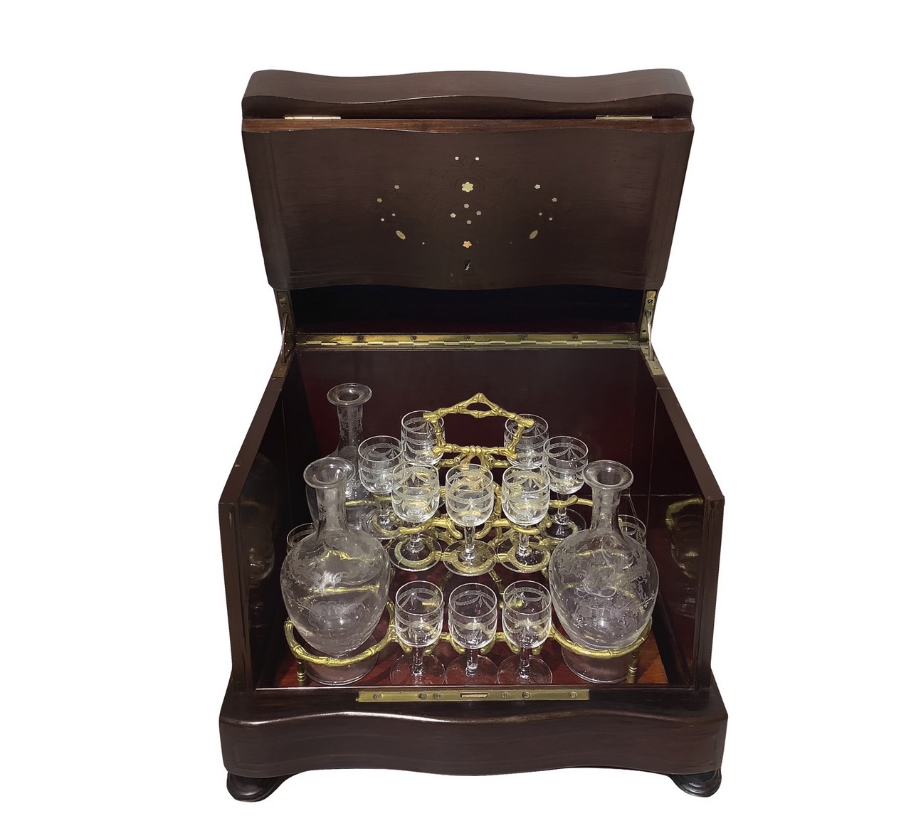 Completo per rosoli in mobiletto a cassetta in legno con intarsi., Napoleon III, sec. XIX