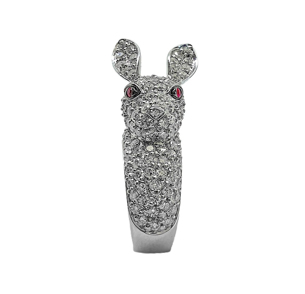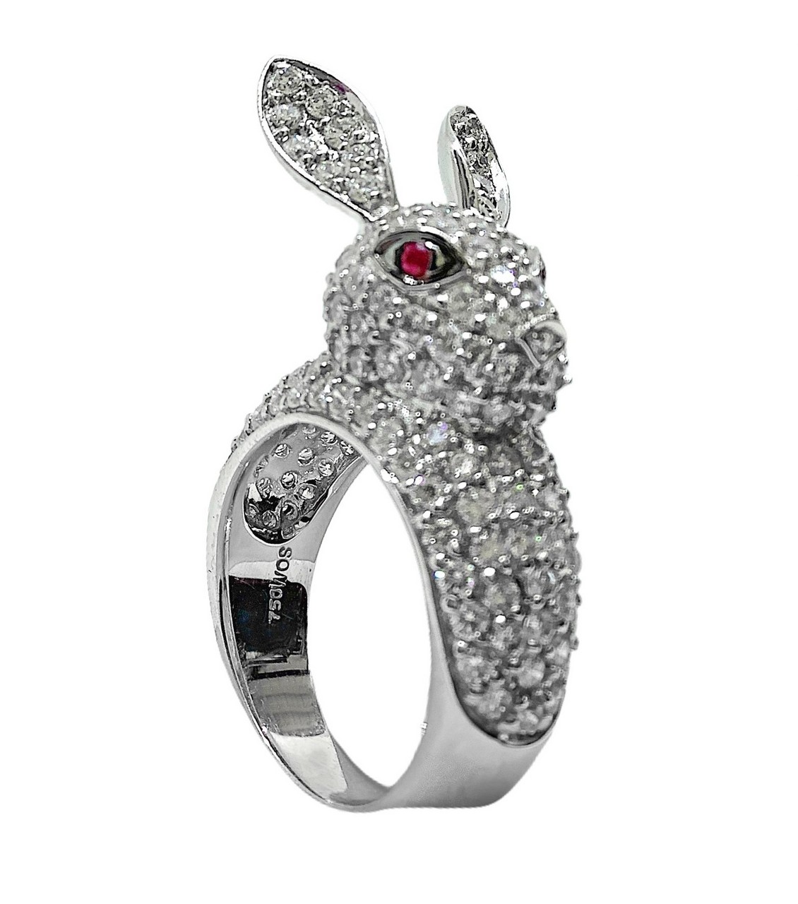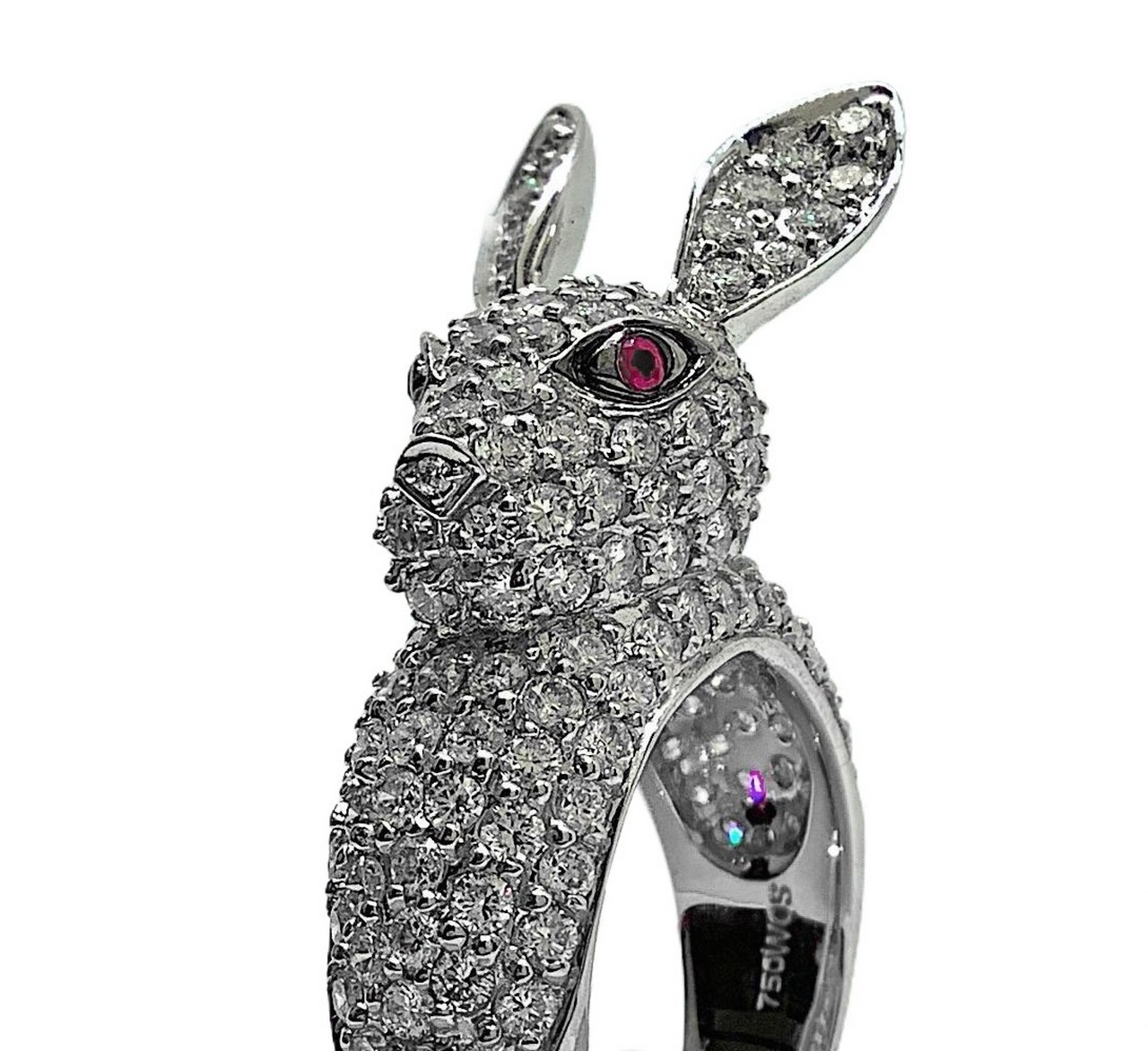 Anello animalier in oro 750, 18 kt con pave' di diamanti naturali non trattati 5.80 ct, colore G e rubini