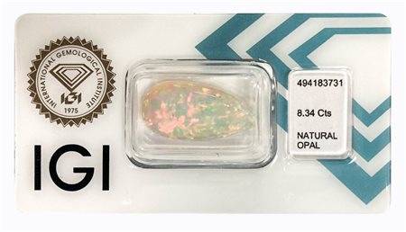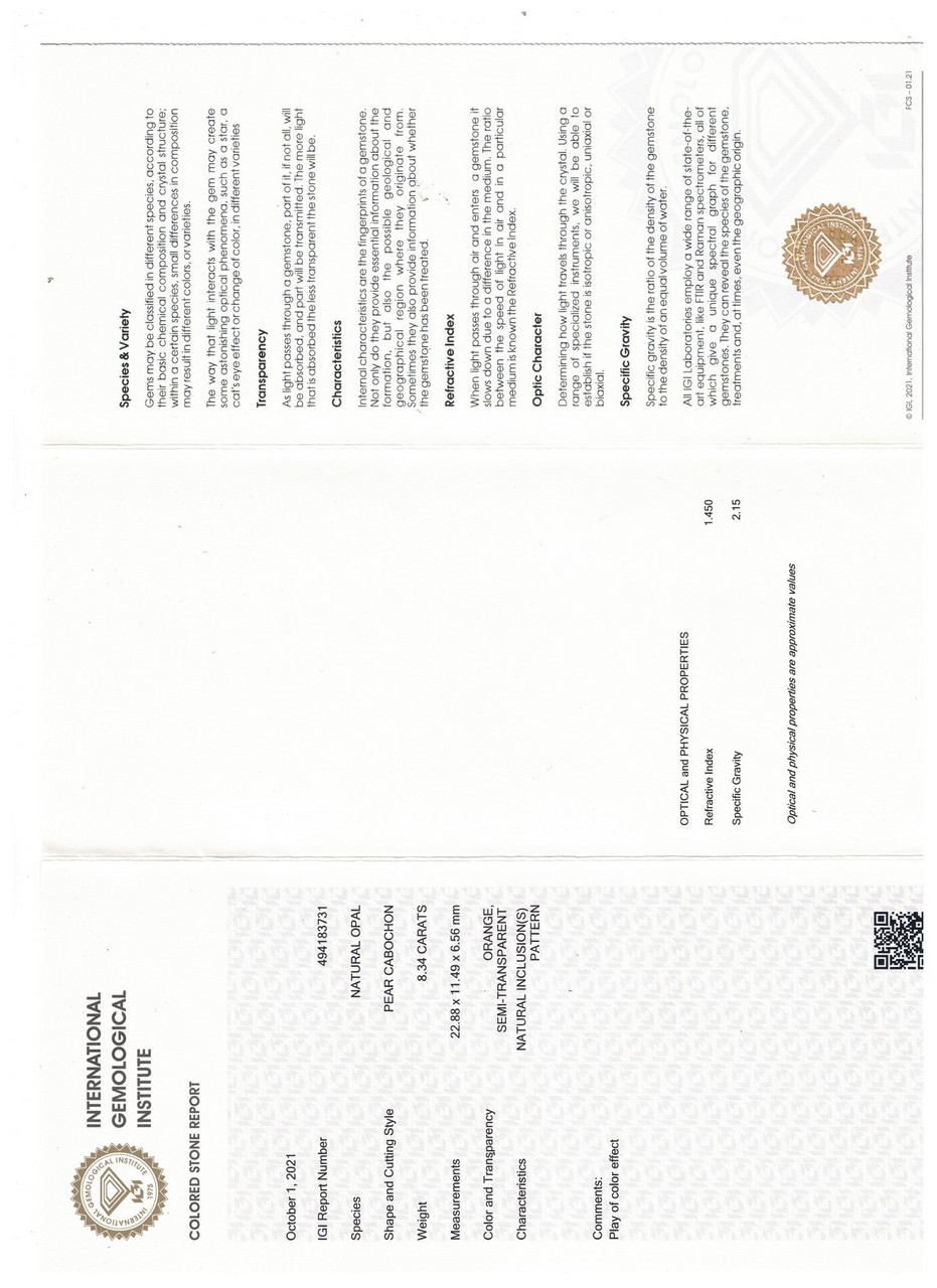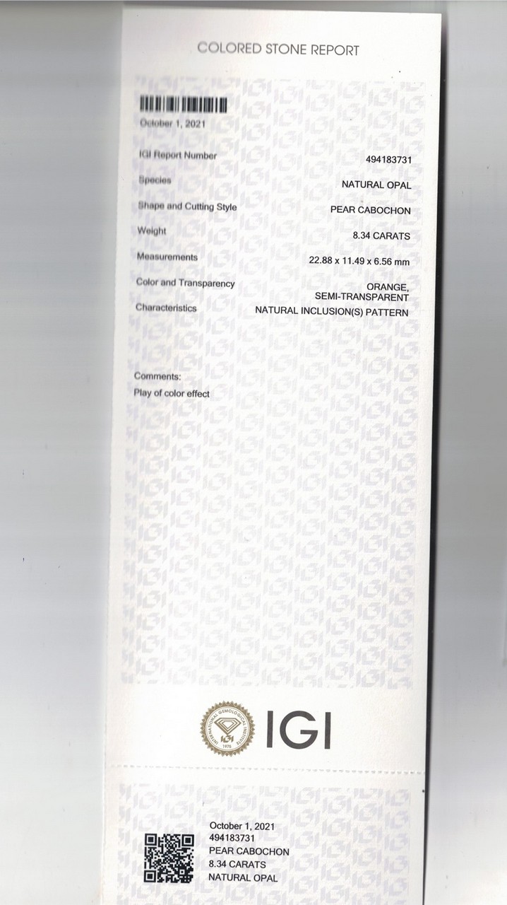 Certificato IGI. Play of color effect. Orange semi trasparente. Forma a pear cabochon.