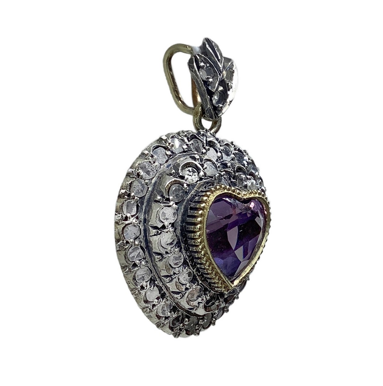 Ciondolo con ametista a forma di cuore in oro basso titolo e argento, doppio giro di diamanti gr. 9,8