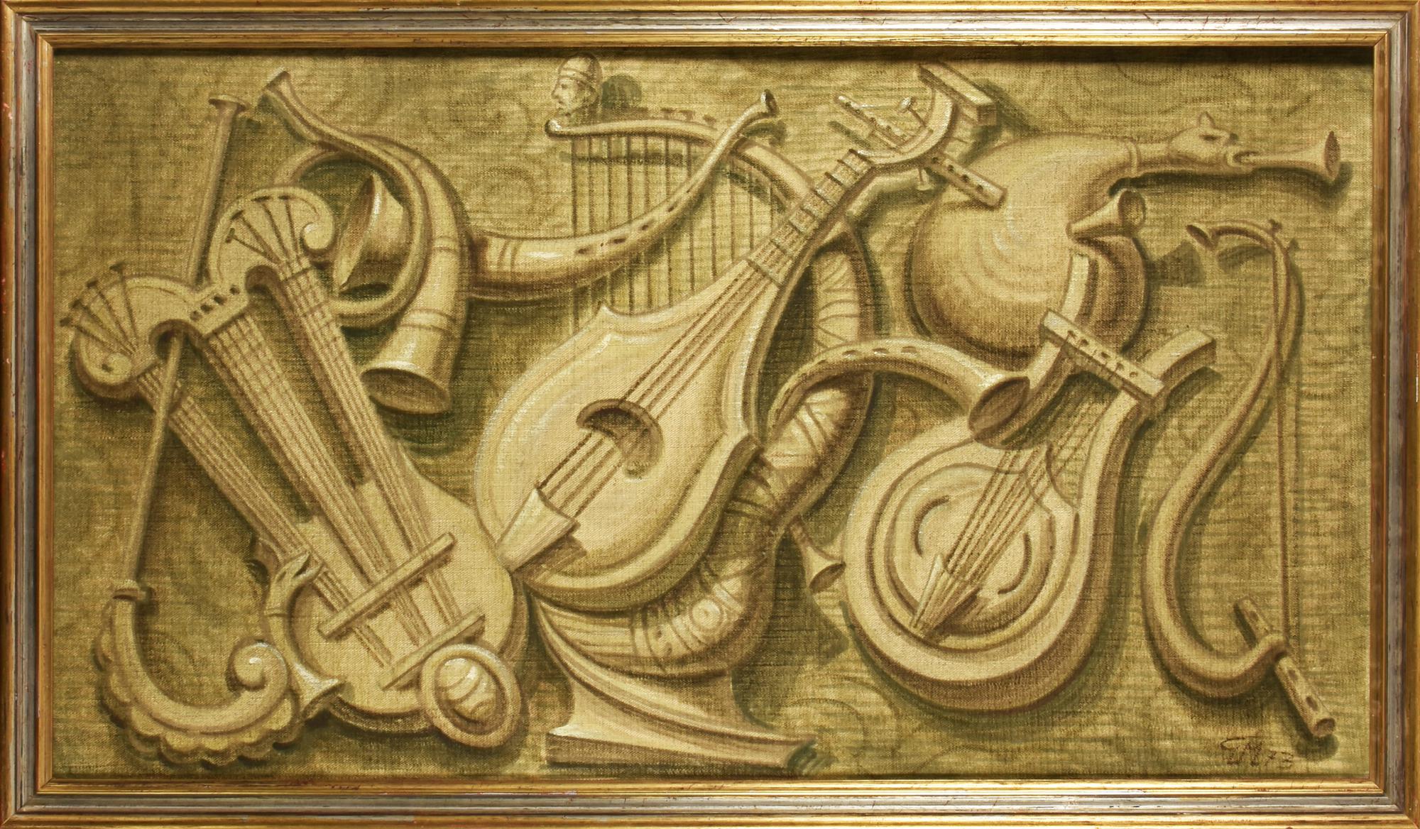 Giovanni Misani STRUMENTI MUSICALI tecnica mista su tela, cm 60x106 firma e...