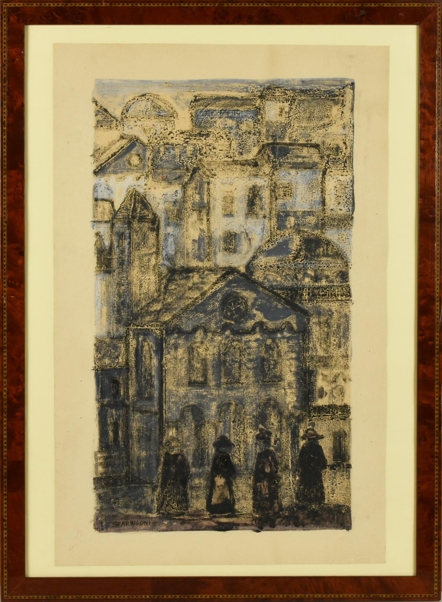 Sergio Arrigoni VEDUTA URBANA E FIGURE pastello su carta, cm 54,5x31, su...