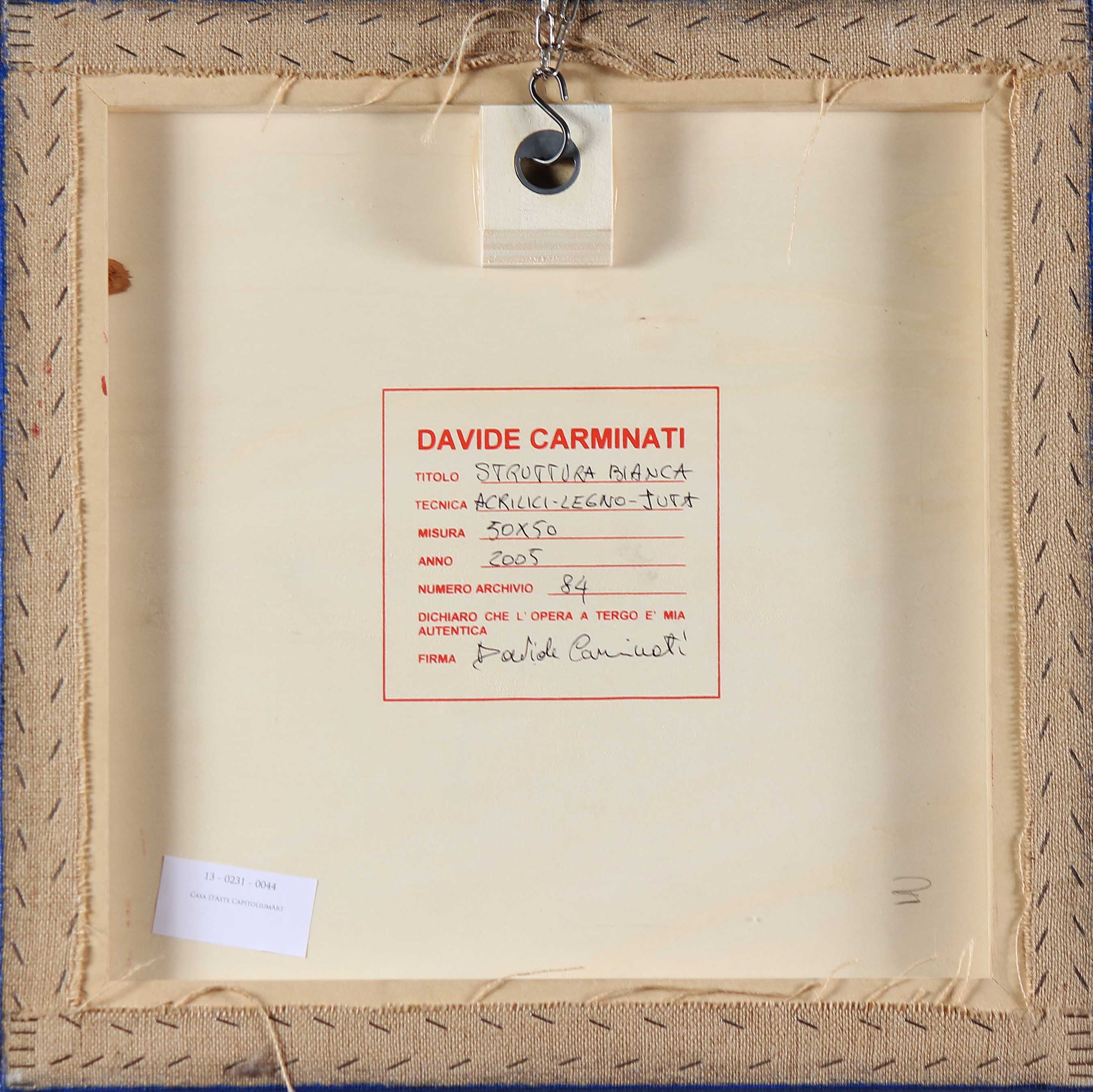 CARMINATI DAVIDE (n. 1958) Struttura bianca. 2005. Acrilici, legno, Juta. Cm 50,00 x 50,00 x 3,00. Al retro titolo, data fimra per autentica e numero d'archivio.