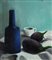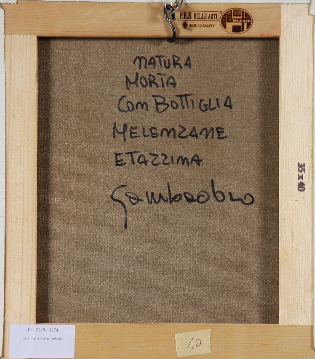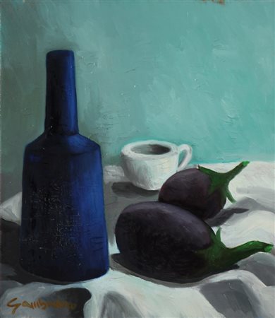 GAMBADORO ANTONINO (n. 1965) Natura morta con bottiglia, melanzane e tazzina. Olio su tela . Cm 35,00 x 40,00 x 2,00. Firma in basso a sinistra. Al retro firma e titolo.