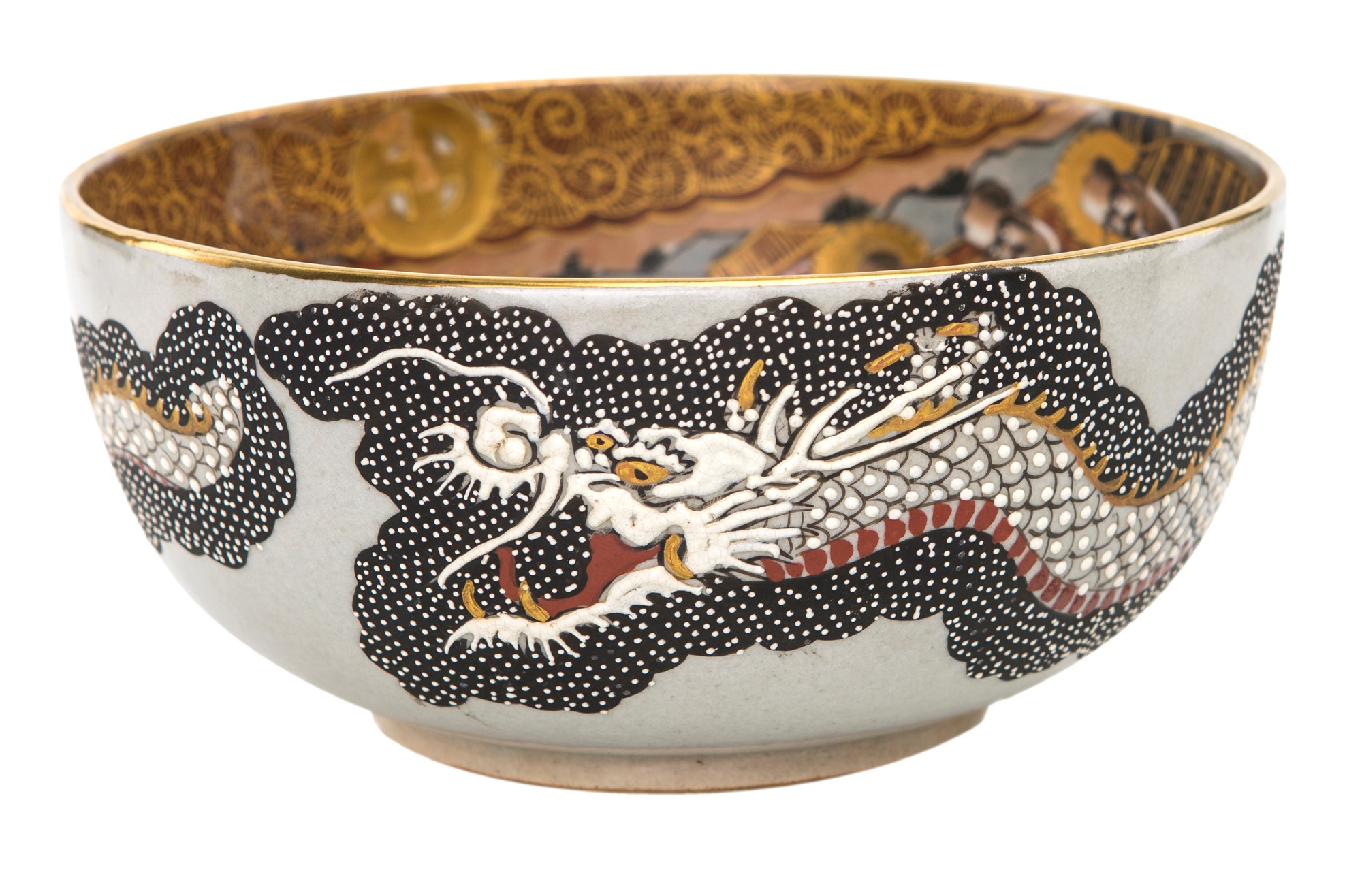 Bowl in porcellana, Giappone decorata in policromia e oro da una figura femminile con drago circondata da numerosi volti di personaggi, cm 9x18,5