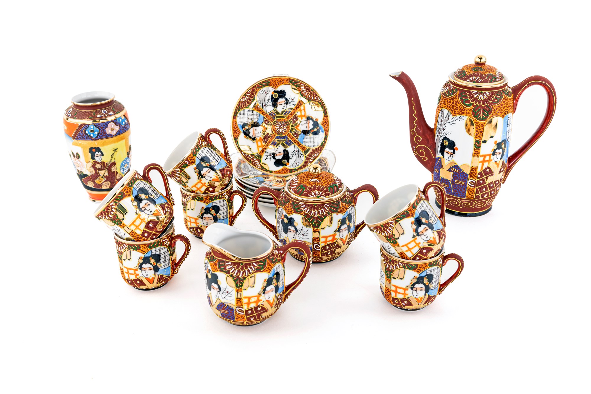 Servizio da caffè in porcellana fine, Giappone, seconda metà del XX secolo decorato da figure femminili in policromia e oro, composto da caffettiera, lattiera, zuccheriera, un vasetto e sei tazze con piattino caratterizzate da volto di geisha visibile controluce sul fondo di ogni tazza, caffettiera cm 19