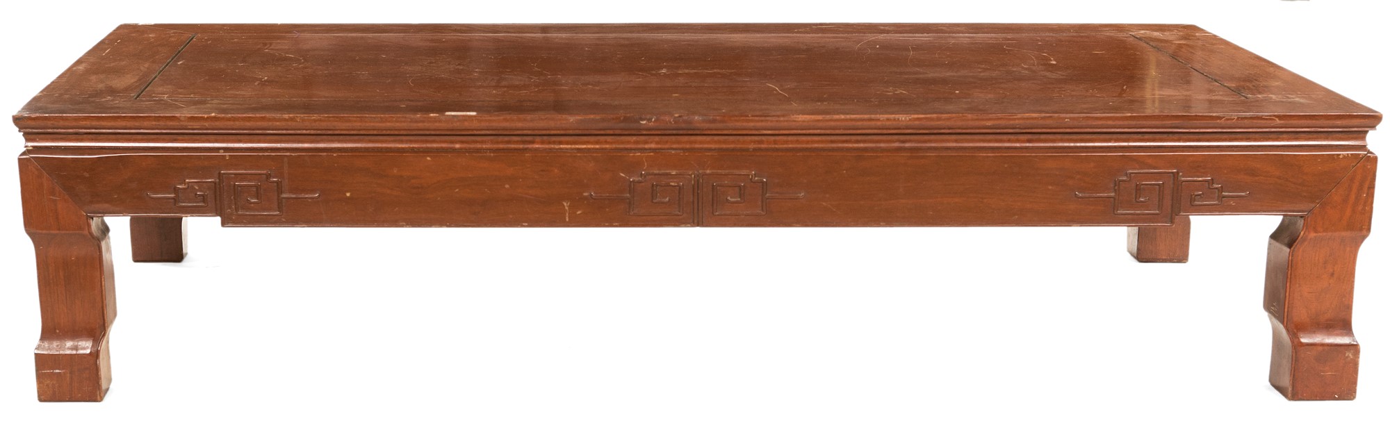 Grande tavolo da salotto in legno di rosa, Cina, XX secolo di forma rettangolare con fascia decorata da greca in rilievo, bassi piedi squadrati, cm 38x170x94