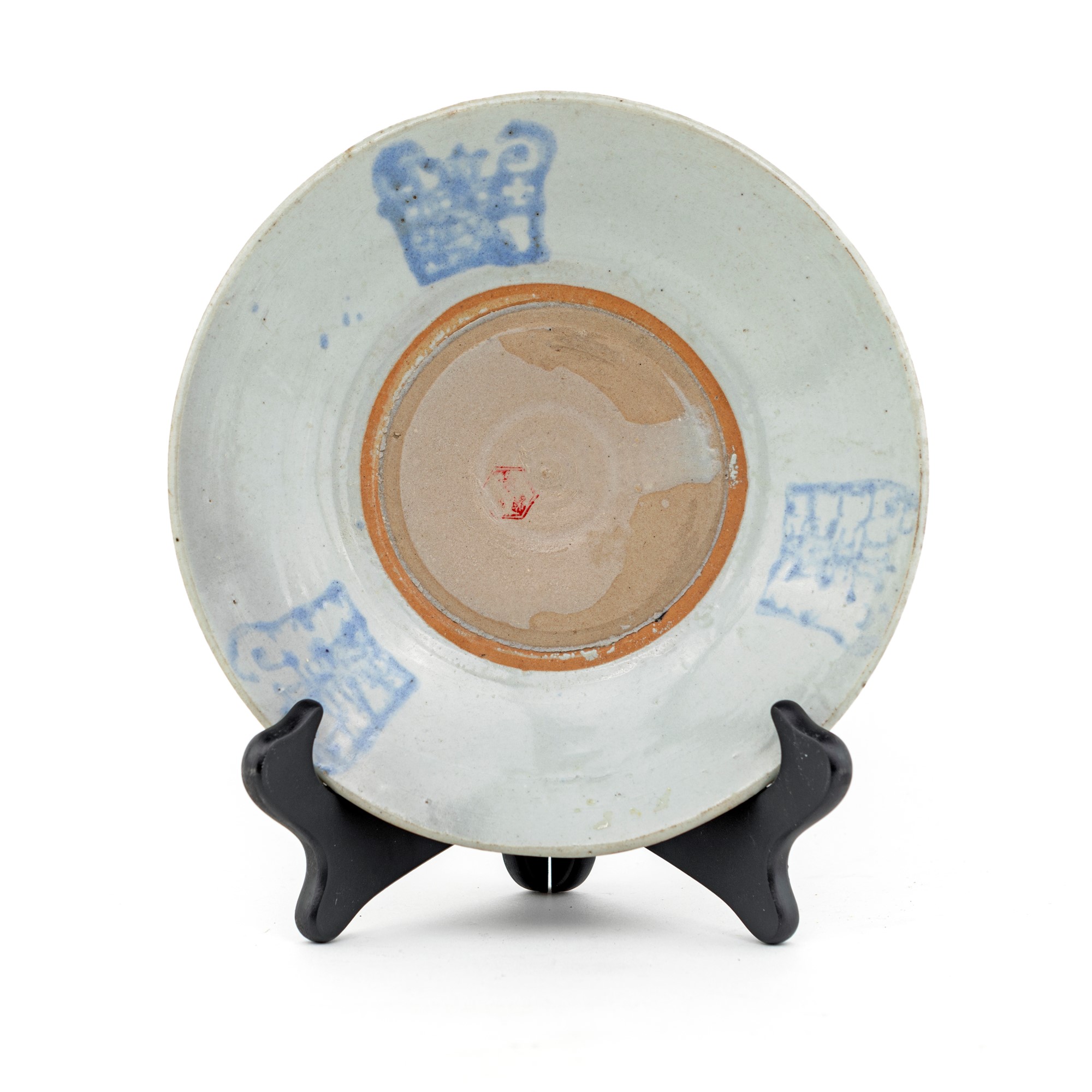Antico piatto fondo in porcellana invetriata, Cina caratterizzato da tre caratteri in blu lungo la tesa, cm 4x22