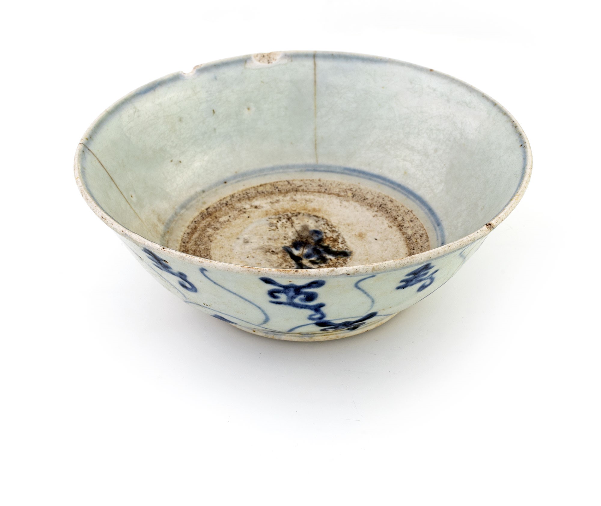 Antica ciotola in porcellana, Cina con decorazione minima in blu su fondo bianco. Rotture e mancanze, cm 7x20