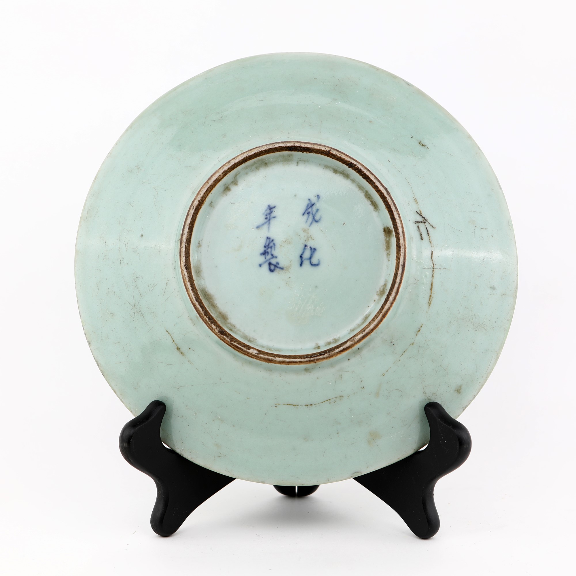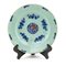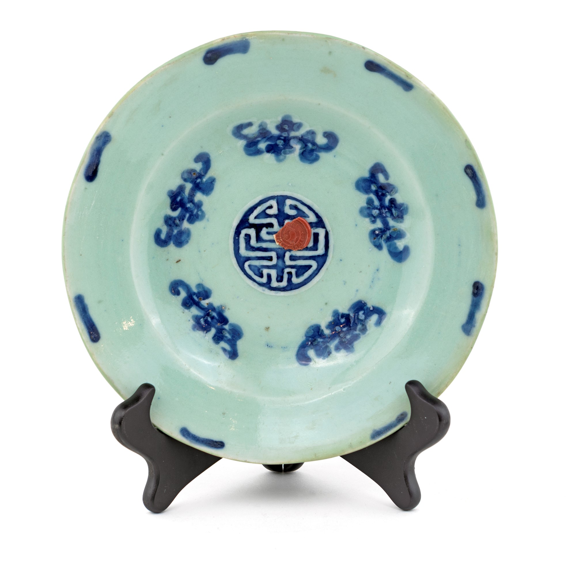 Piatto in porcellana, Cina, XVIII secolo decorato in blu su fondo celeste con segno beneaugurante shou di lunga vita al centro e cinque figure di pipistrello tutt'intorno. Timbro in ceralacca e marchio in blu a quattro caratteri al verso, diametro cm 23