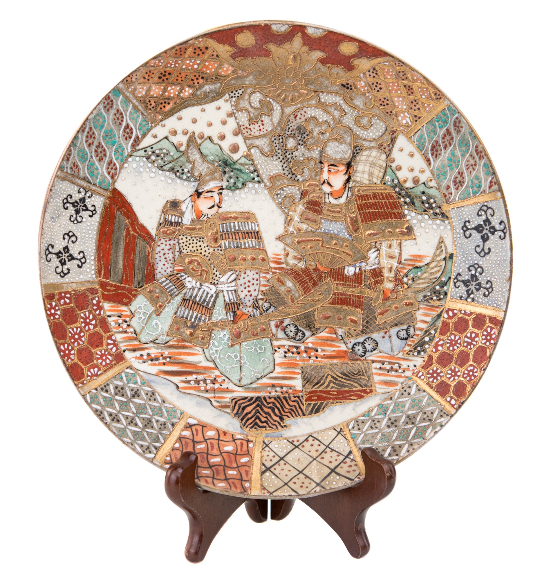 Piatto in porcellana, Giappone decorato da figura di guerriero nei modi delle ceramiche di Satsuma, diametro cm 24,5