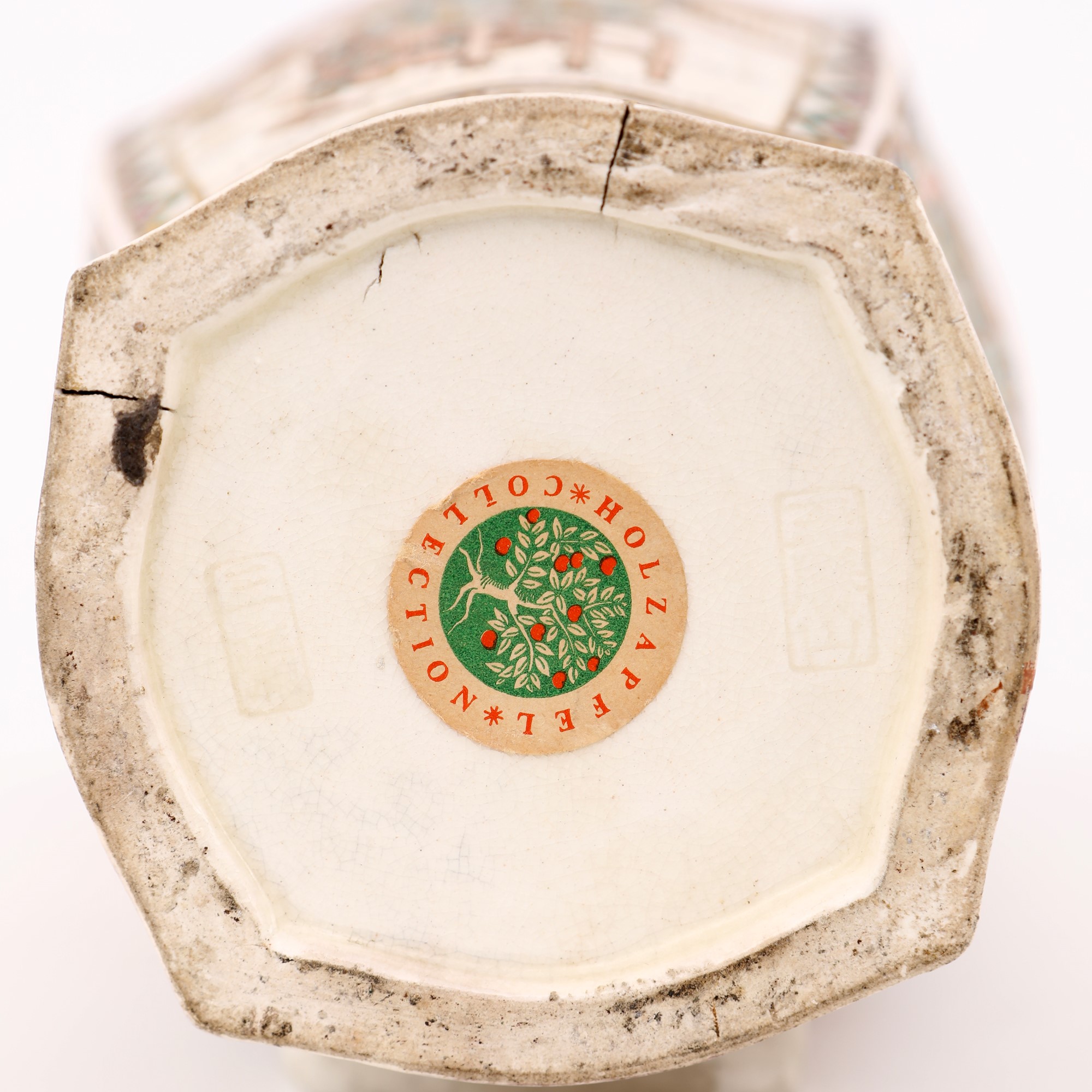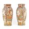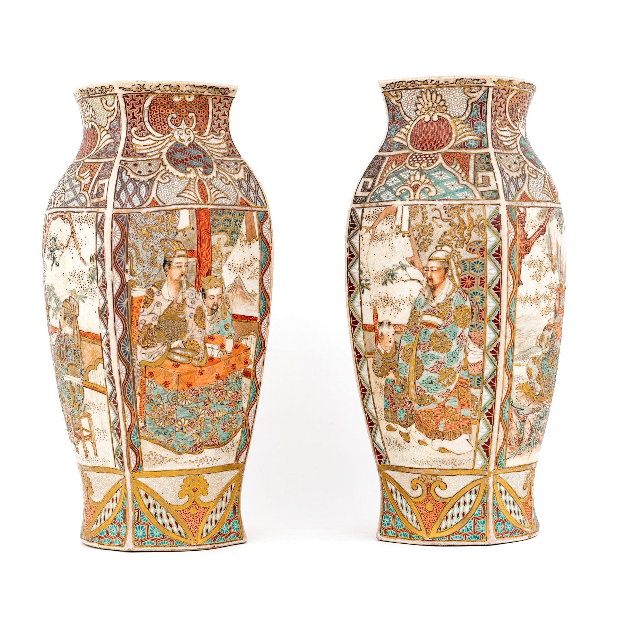 Coppia di vasi a pianta quadrilobata, Giappone decorati nei toni dominanti del rosso e verde giada con scene di genere animate da figure su fondo crema; tutta la superficie è impreziosita da minuta decorazione rilevata in oro e smalto bianco, altezza cm 24