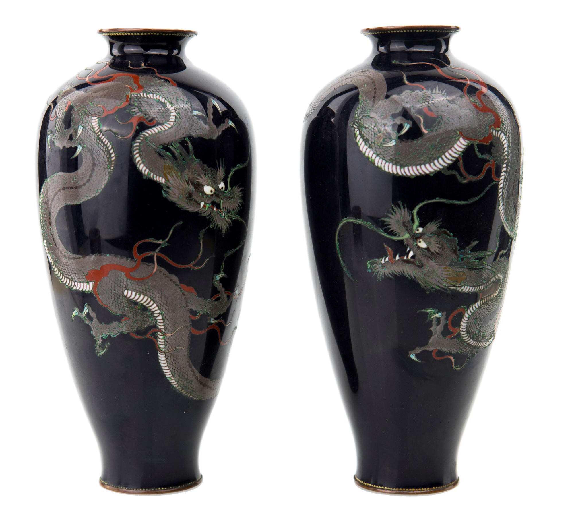Coppia di vasi in metallo smaltato blu, Cina decorati da grandi figure di drago con corpi caratterizzati da squame realisticamente rese da lamelle ruvide; orlo superiore ribattuto, altezza cm 25