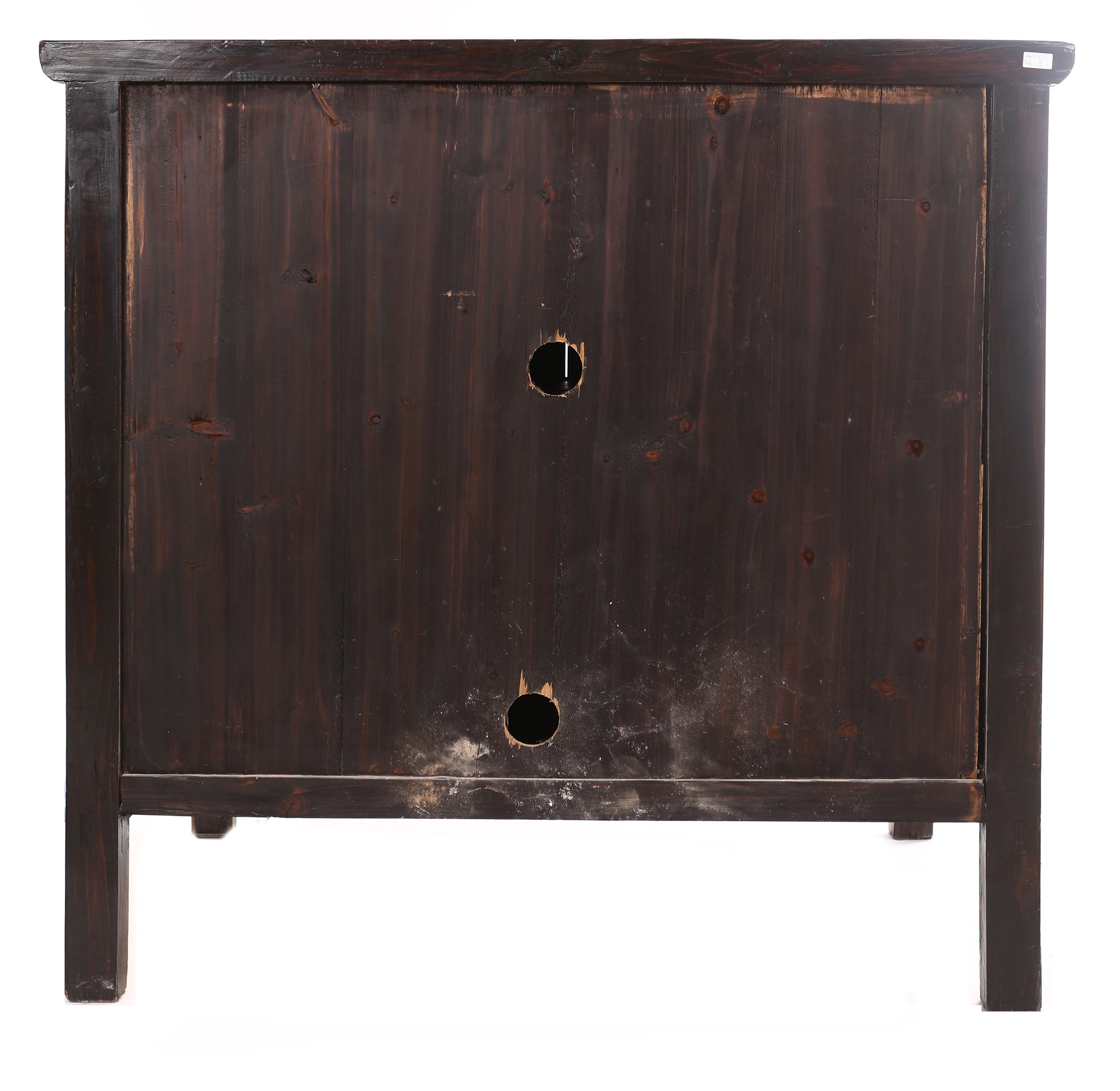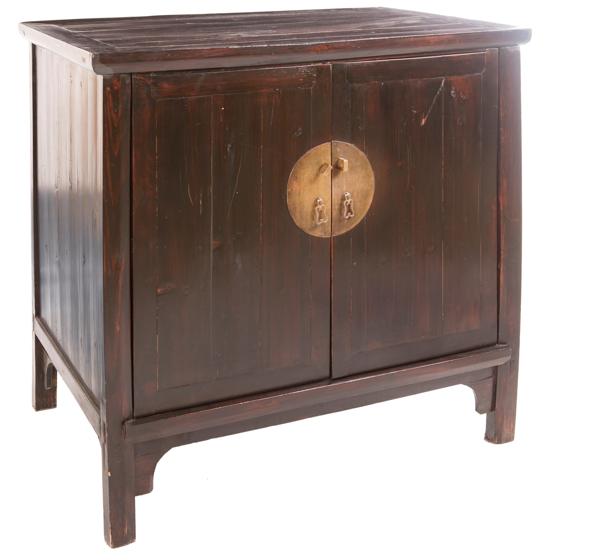 Cabinet in legno, Cina, dinastia Qing con due ante frontali chiuse da placca circolare in bronzo e ripiano interno; piedi a pilastro , cm 96,5x99,5x67,5