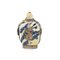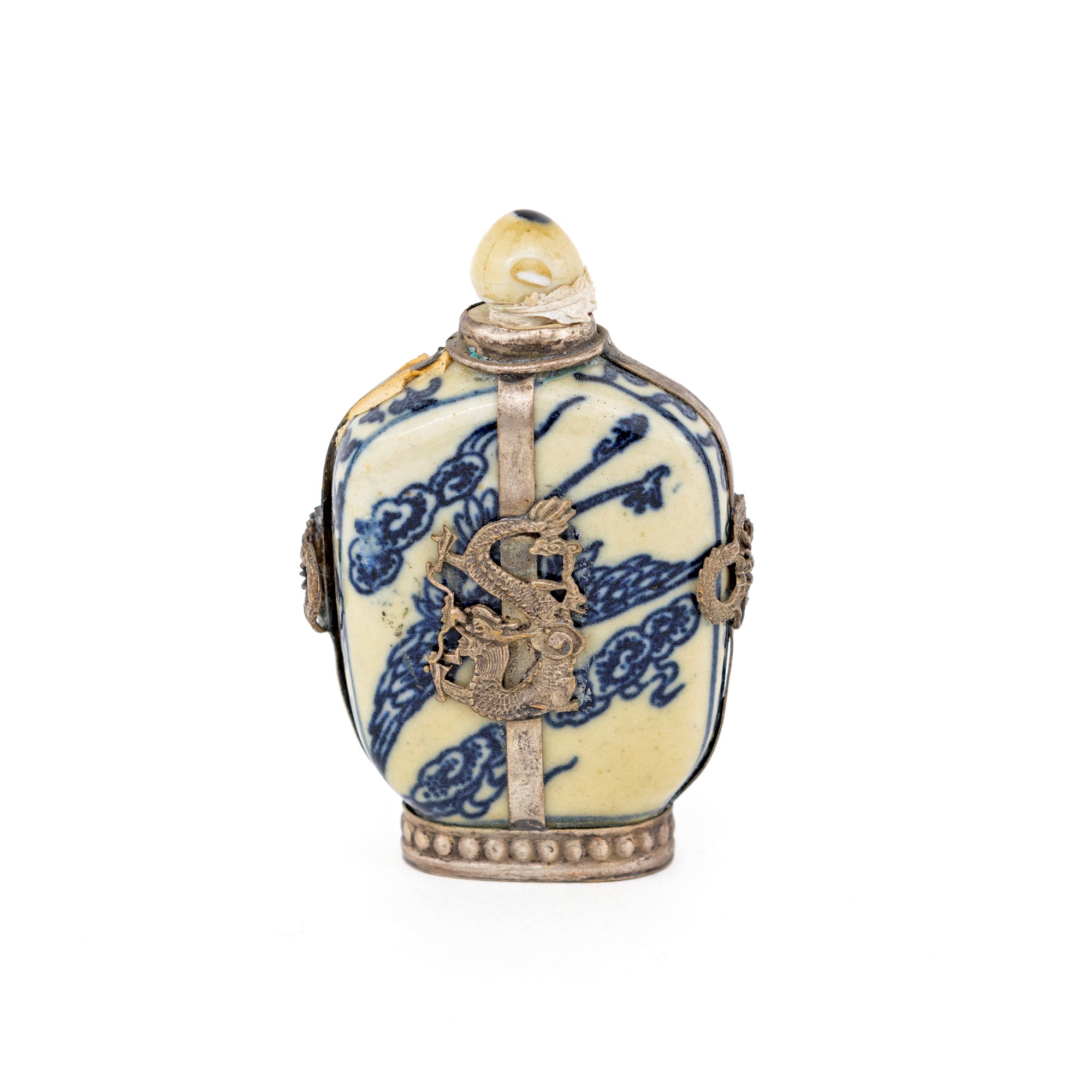 Snuff bottle in porcellana bianca e blu, Cina, fine del XIX/inizio del XX secolo decorata con figure di nuvole e aironi ed impreziosita da ingabbiatura in metallo argentato con figure di drago e di fenice, cm 8,5x5x2
