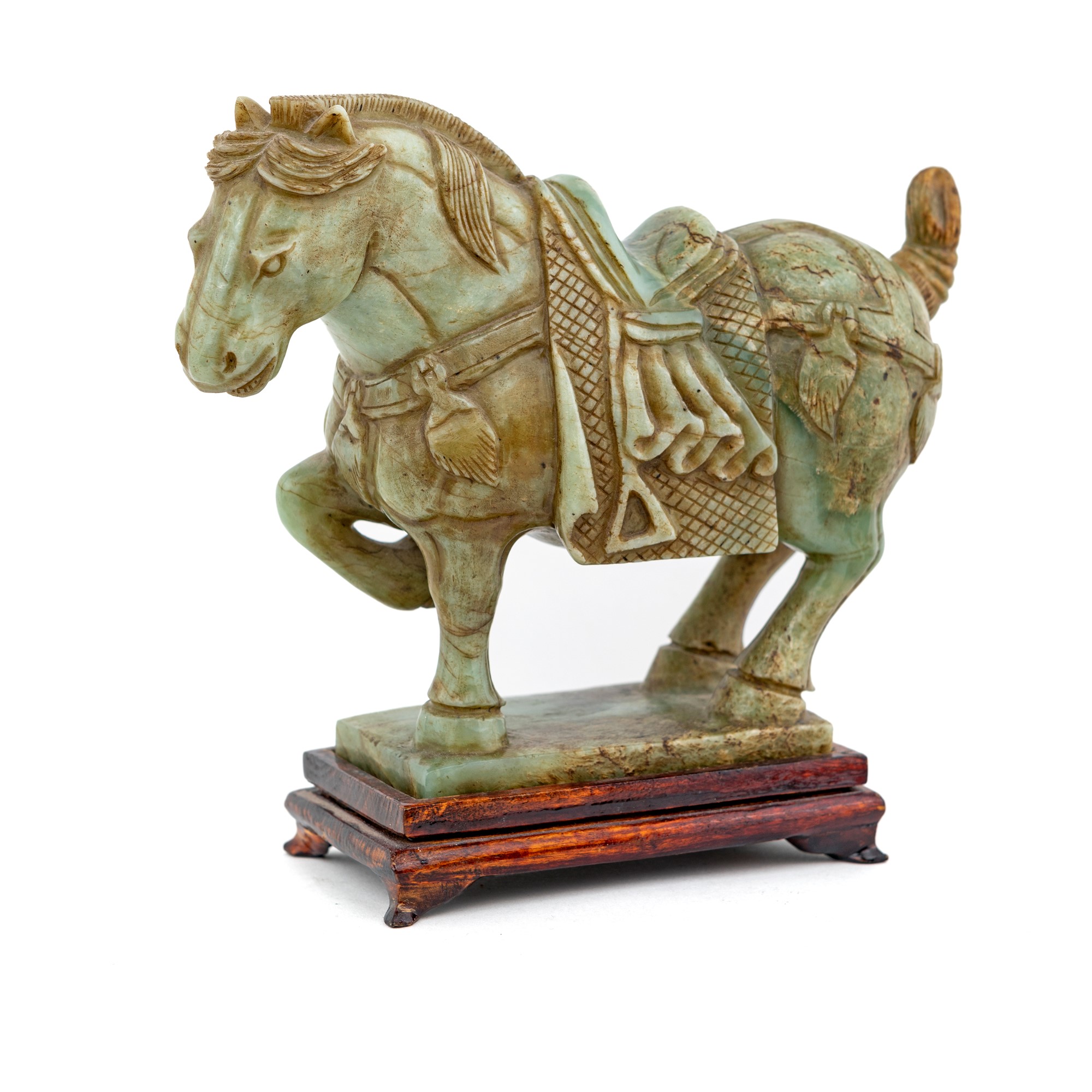 Scultura in giada nefrite, Cina, XX secolo raffigurante un cavallo bardato; base in legno, cm 19x24x7,5 - con la base cm 21,5x24x9