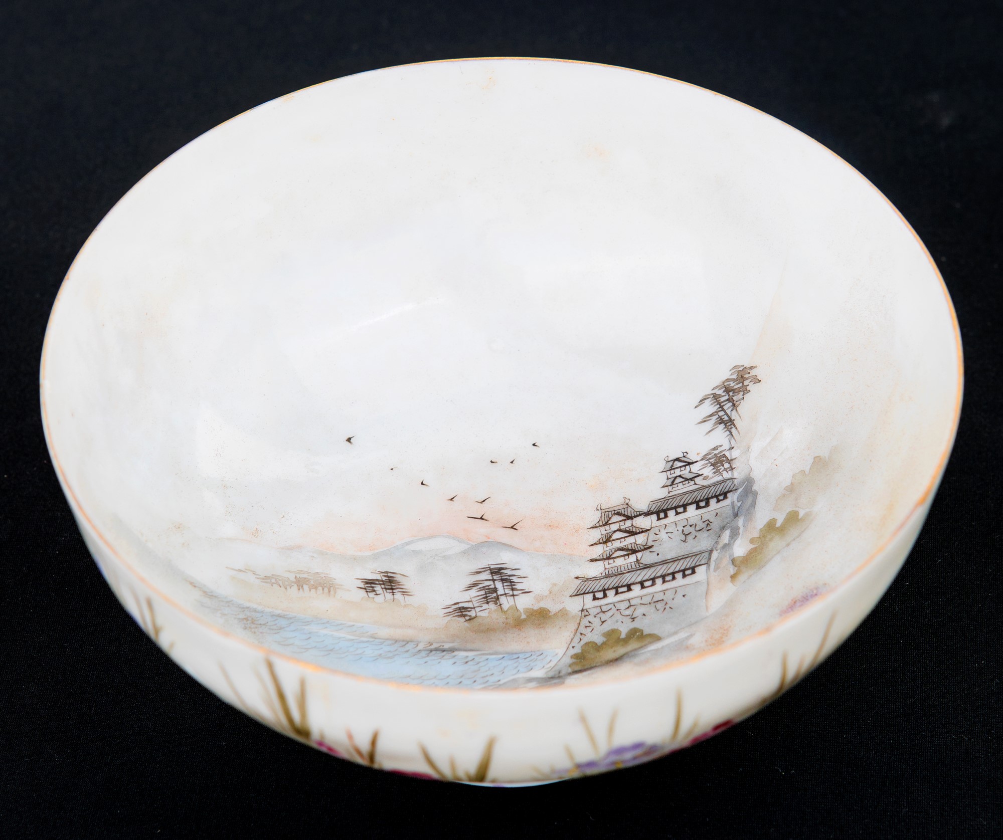Bowl in porcellana fine, Cina decorata all'interno da un paesaggio con architetture e lungo la superficie esterna da figure di airone in volo, cm 7x15,5