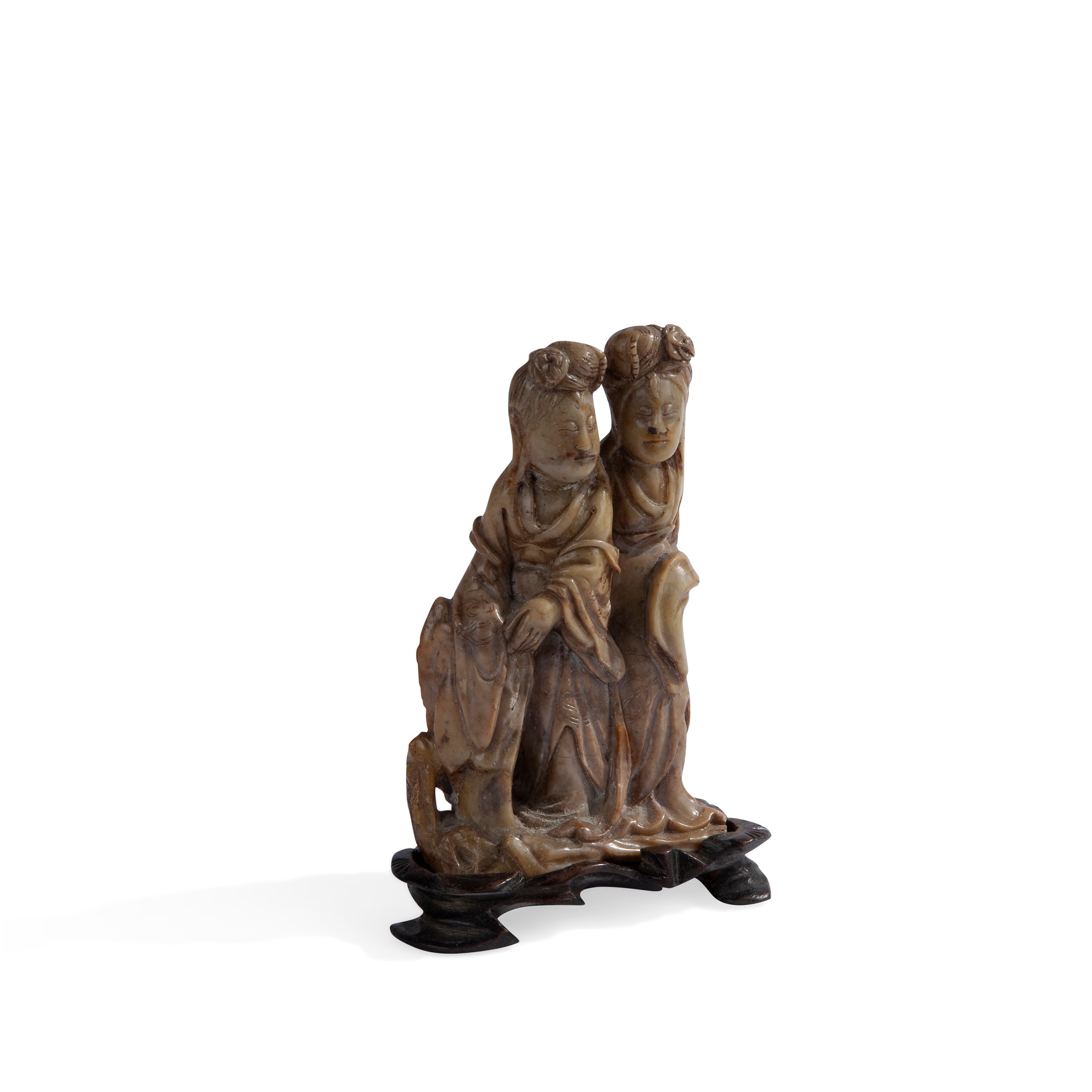 Intaglio in pietra dura, Cina, XX secolo riproducente due figure femminili su base in legno, cm 11x6,5x3 - la base: cm 1x8,5x4