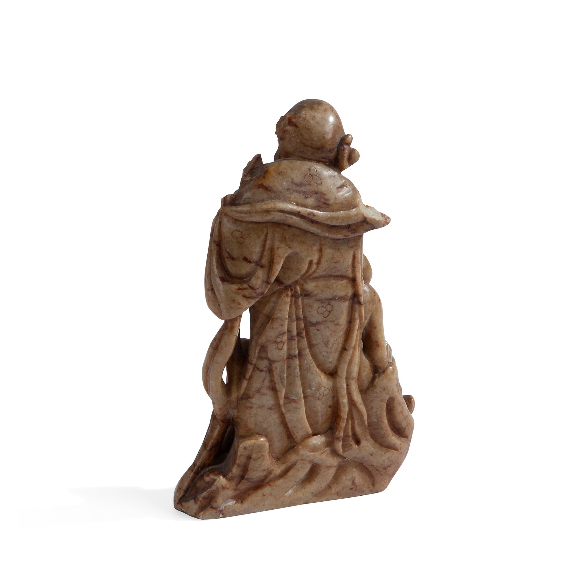 Intaglio in pietra dura, Cina, XX secolo raffigurante un saggio con bastone e pesca in mano, affiancato da uno shishi cavalcato da un bimbo, cm 11,3x8x2