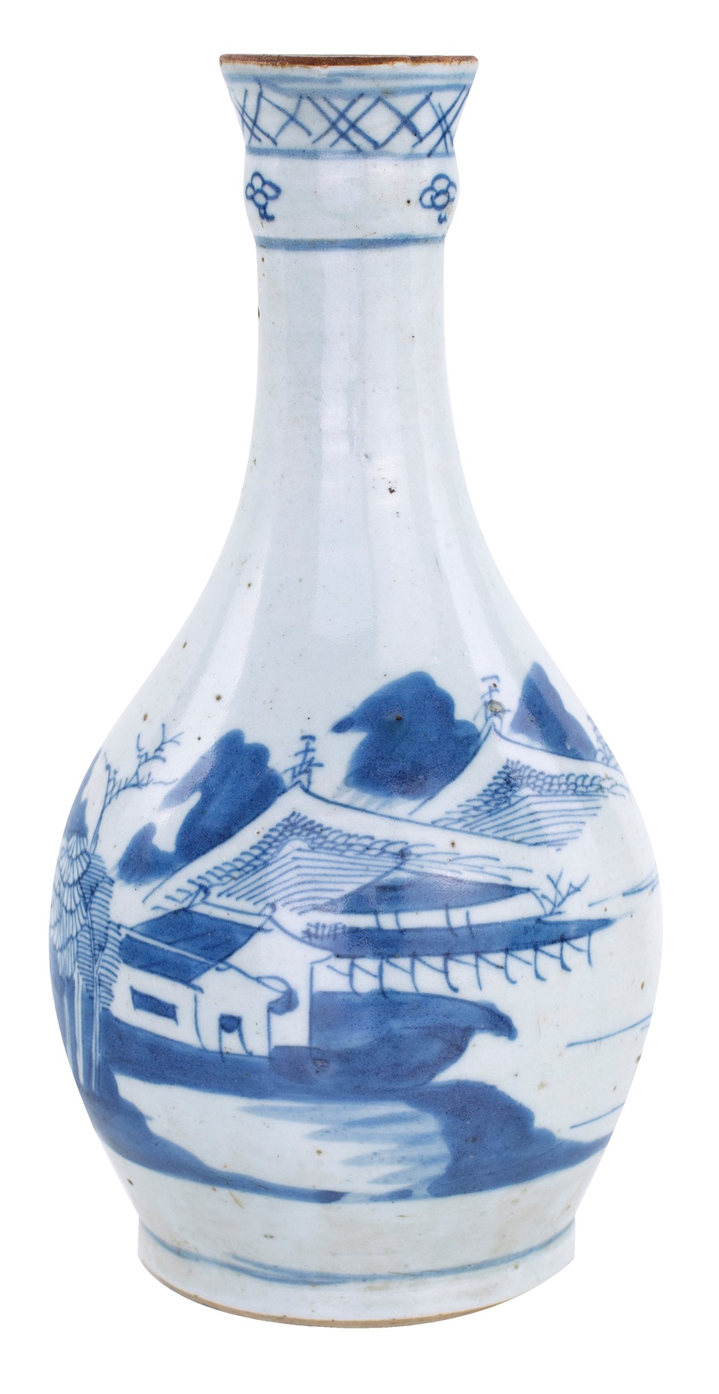 Vaso a bottiglia in porcellana bianca e blu, Cina decorato da un paesaggio con abitazioni, altezza cm 24