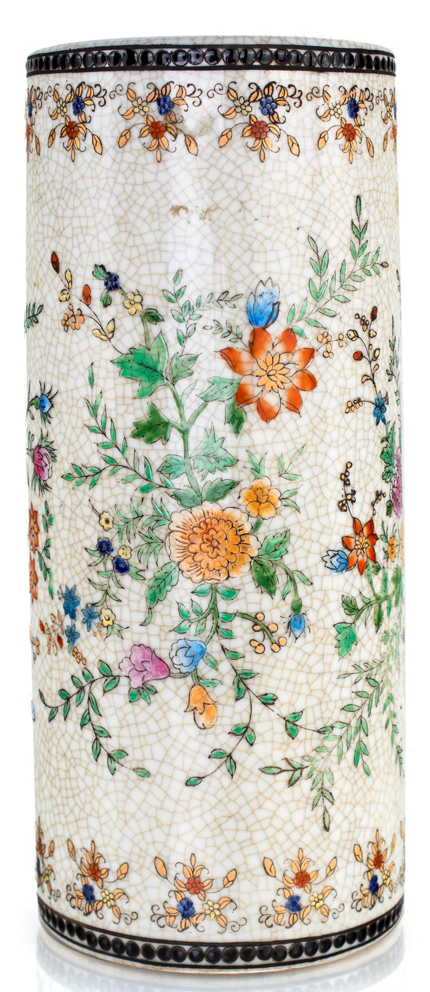 Vaso cilindrico in porcellana, Cina decorato da composizioni floreali su fondo bianco craquelé, altezza cm 30,5x13