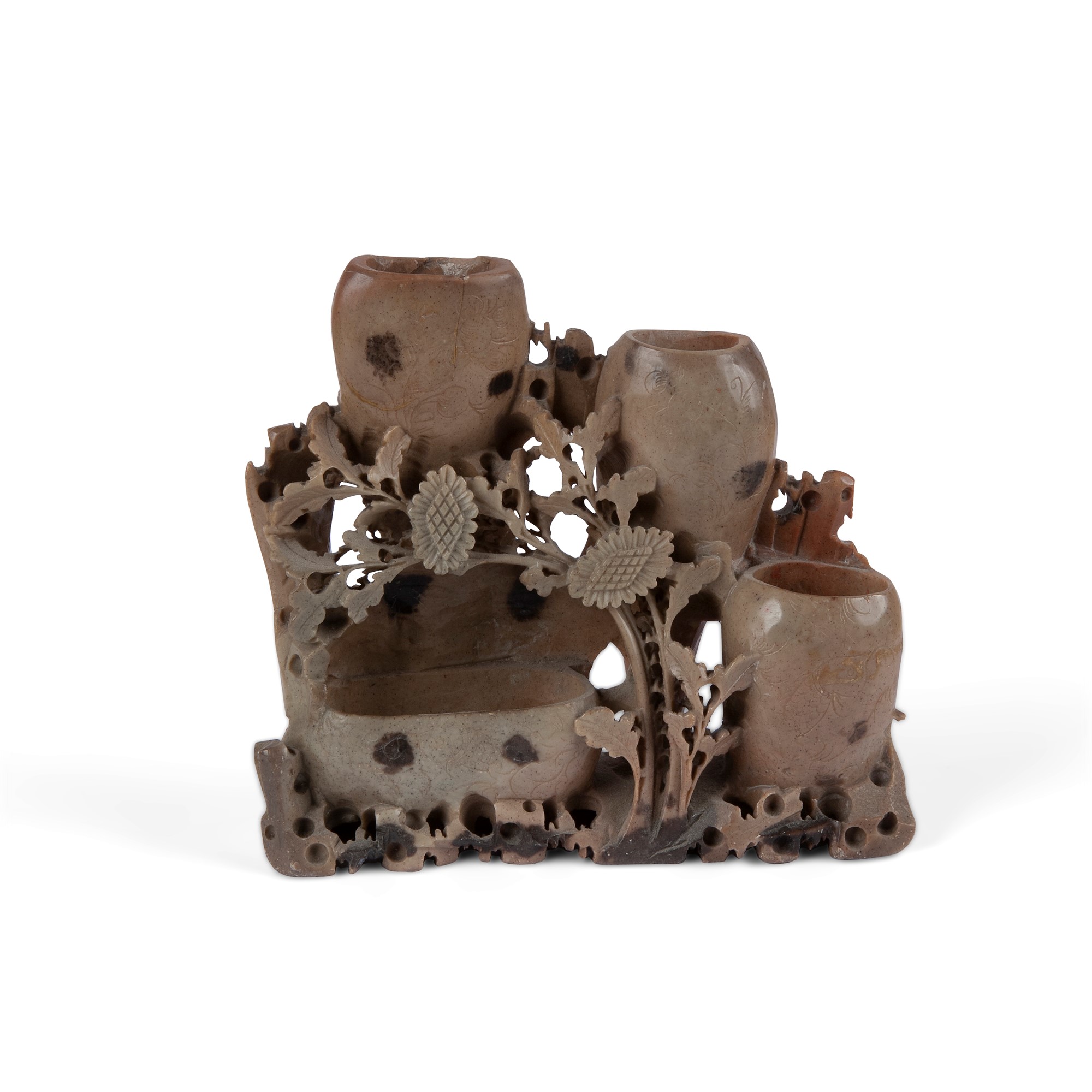 Gruppo in pietra saponaria maculata a quattro vaschette, Cina, XX secolo caratterizzate da tralci fioriti intagliati. Piccole rotture, cm 17,5x19x4