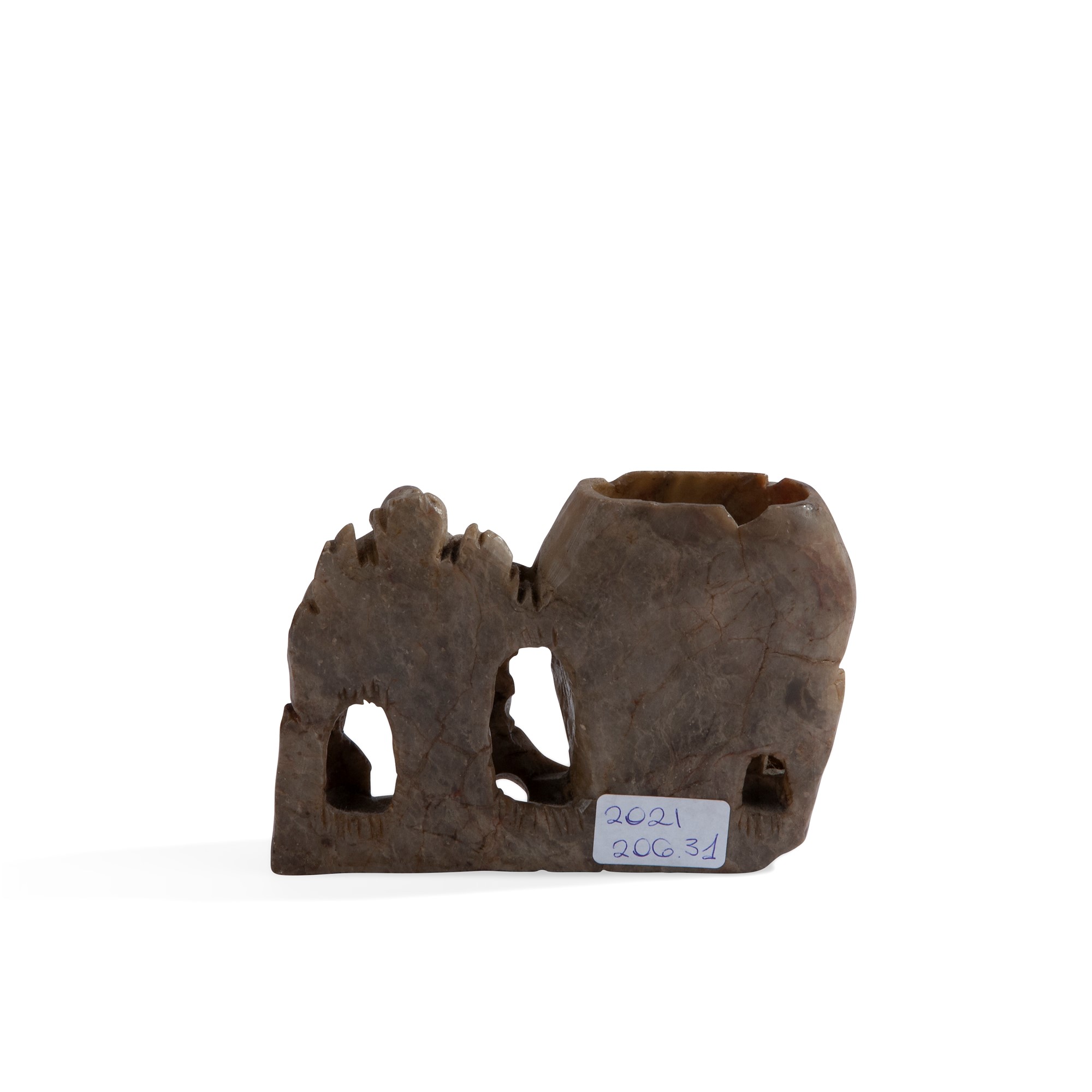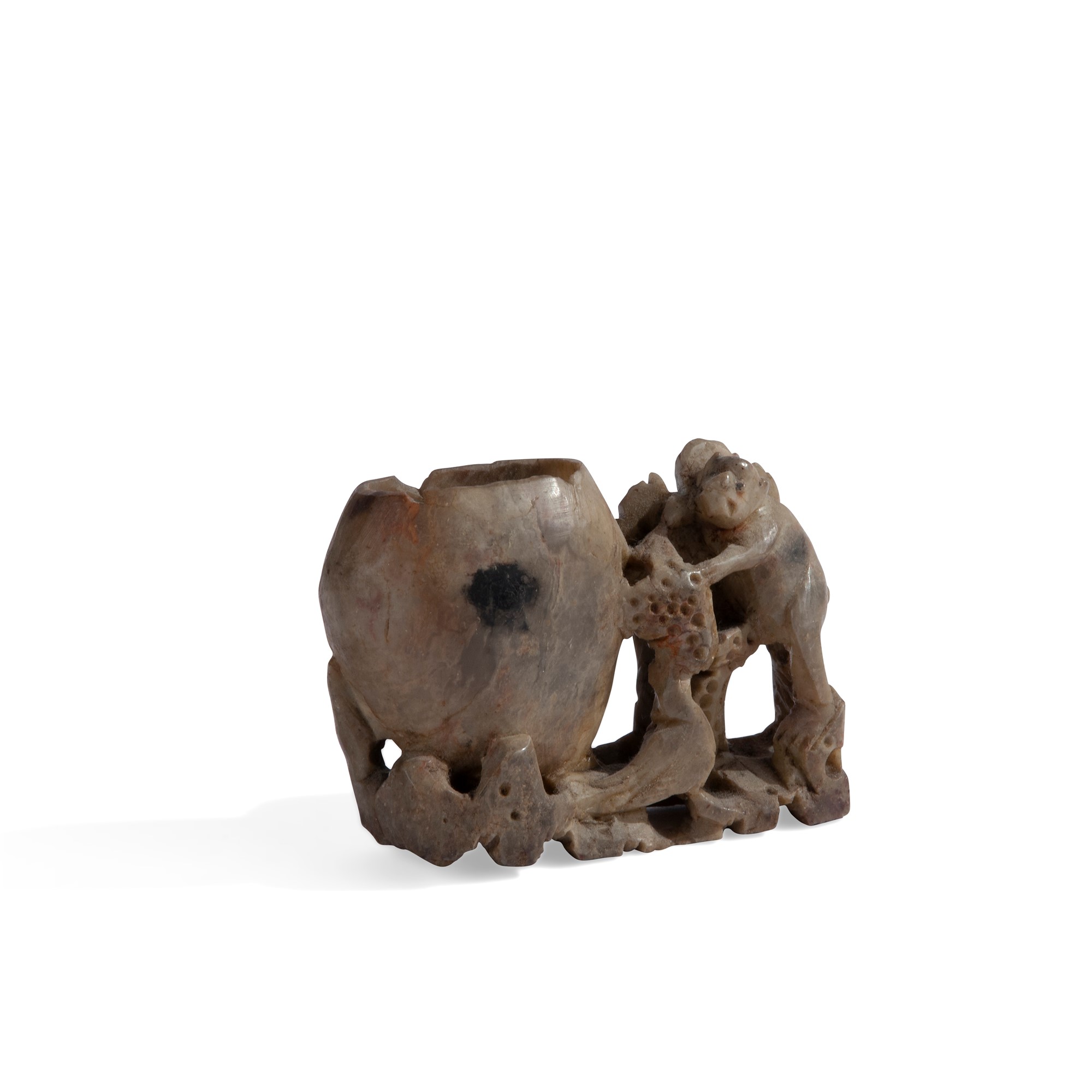 Vaso in pietra dura, Cina, XX secolo di forma ovale con scimmia e airone intagliati. Piccole rotture, cm 8x11x3,5