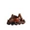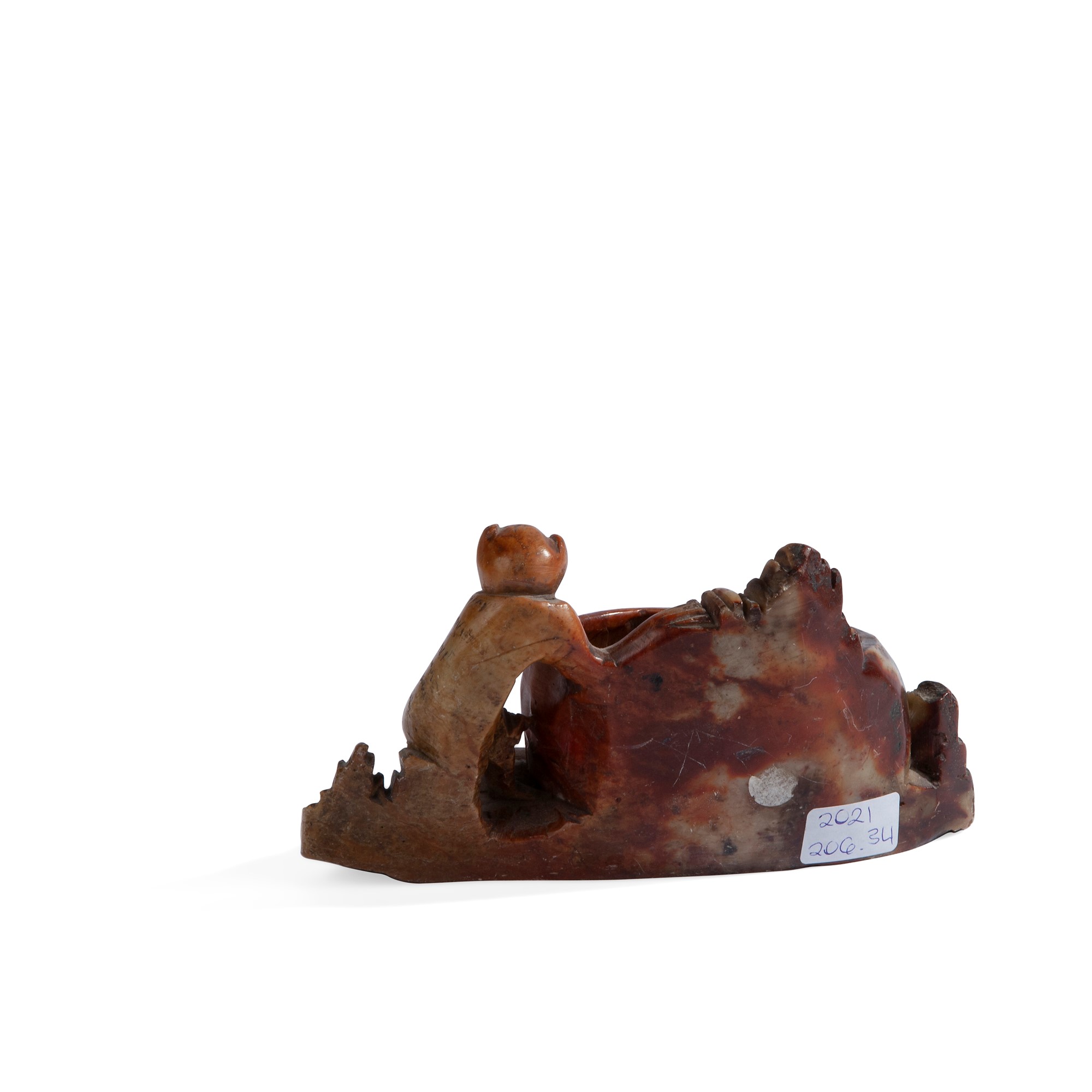 Portafiori in pietra rossa, Cina, XX secolo affiancato da una scimmia seduta e da un piccolo uccello in bassorilievo alla base, cm 8,5x16,5x7