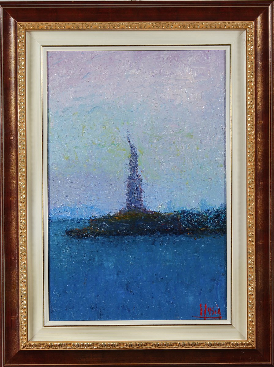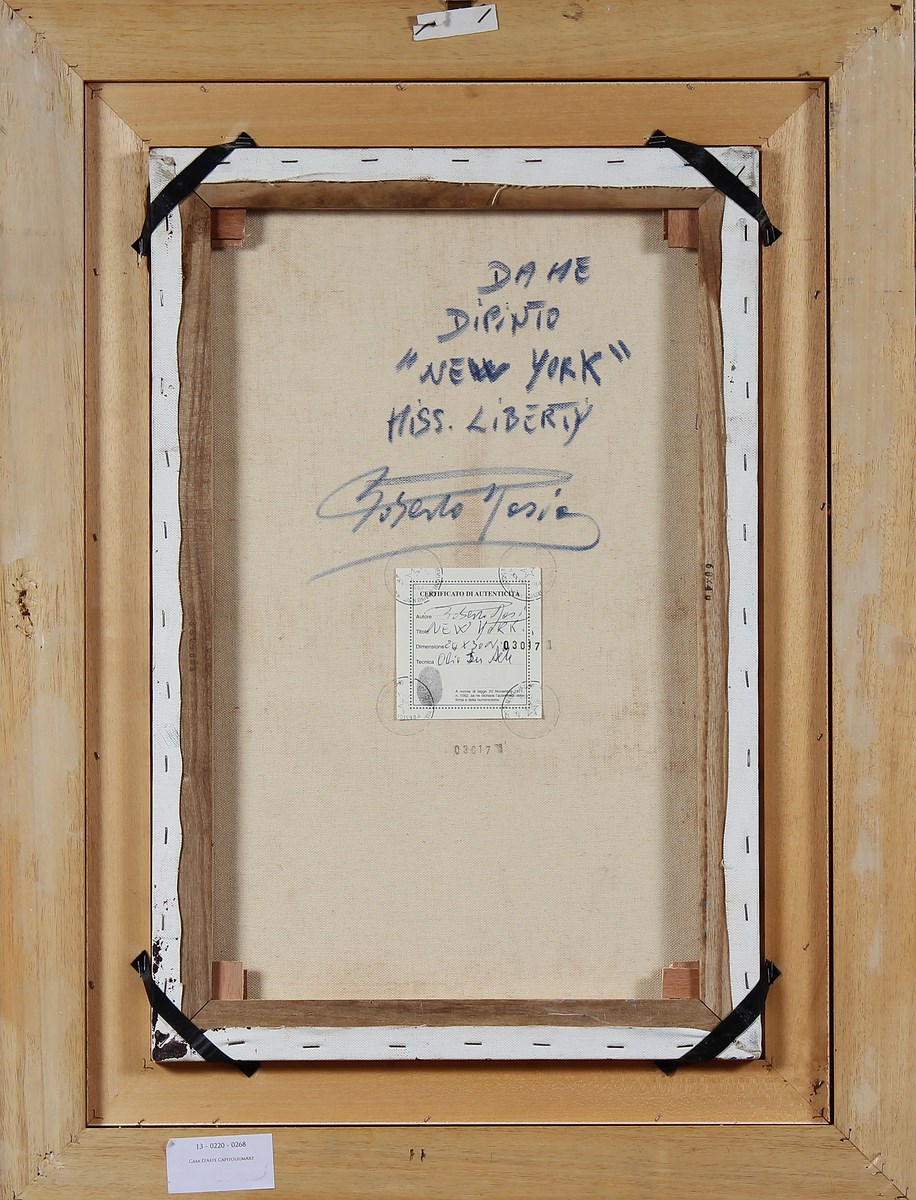 MASIA ROBERTO (n. 1958) New York, Miss Liberty. Olio su tela . Cm 40,00 x 60,00. Firma in basso a destra. Al retro titolo, firma per autentica e certificato di autenticità. Cornice presente