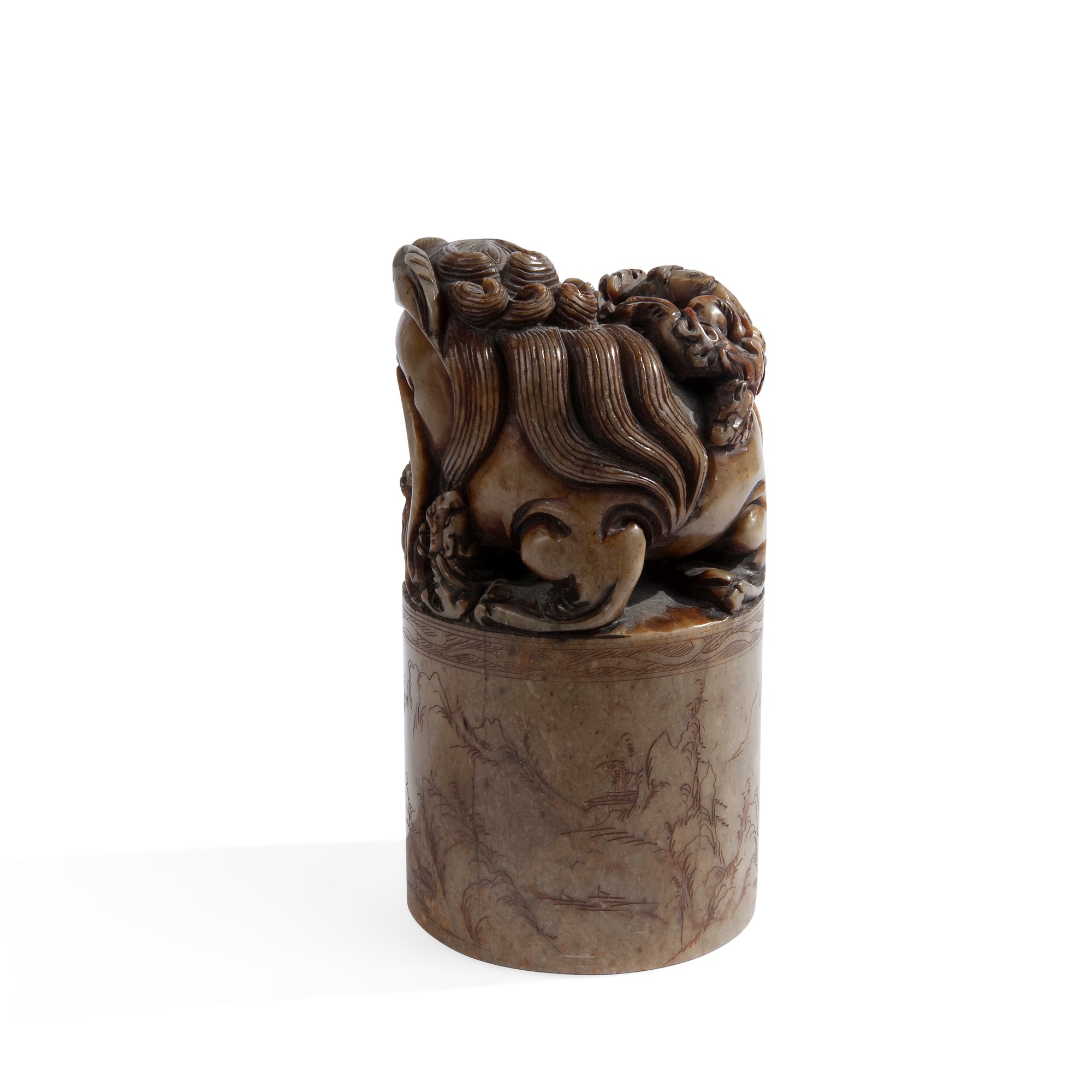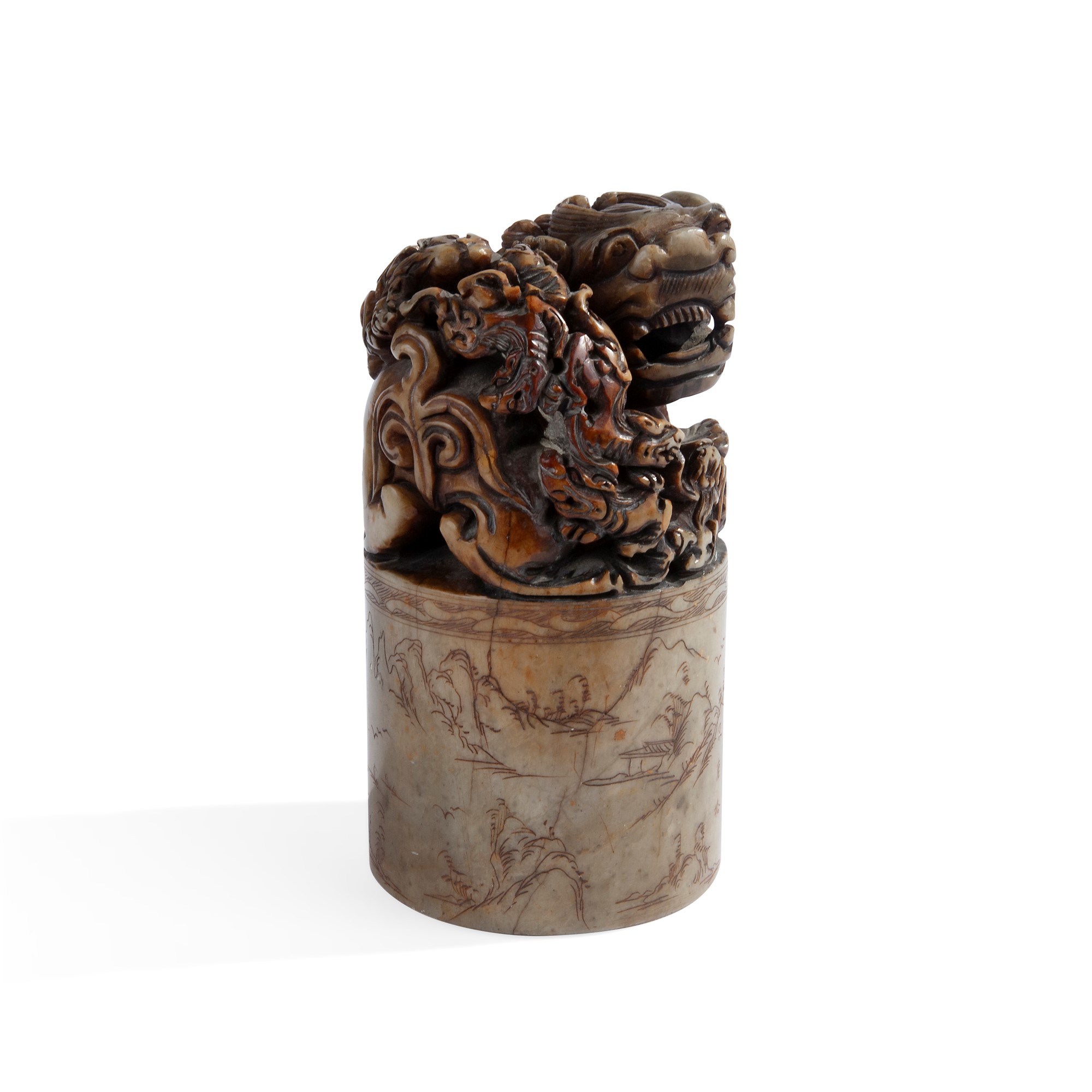 Sigillo circolare in marmo, Cina, XX secolo con paesaggio ed iscrizioni incise, e ideogrammi sotto la base, sormontato da cane di Pho con cuccioli e sfera sotto la zampa, cm 15x8