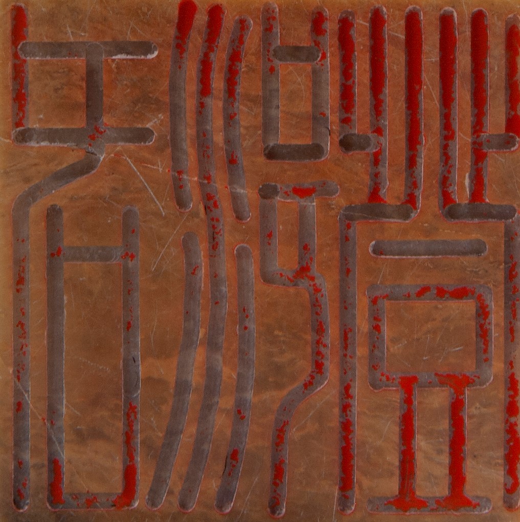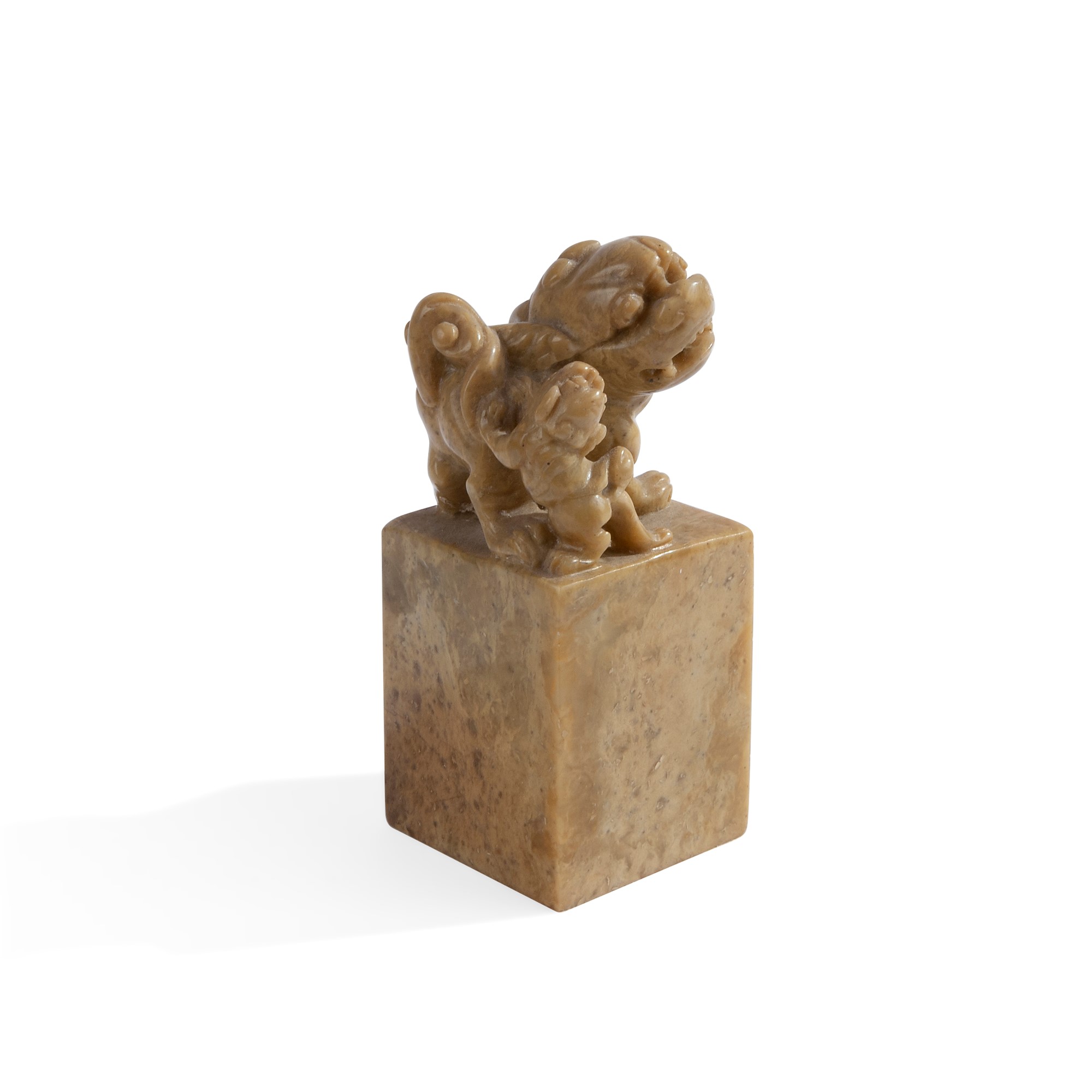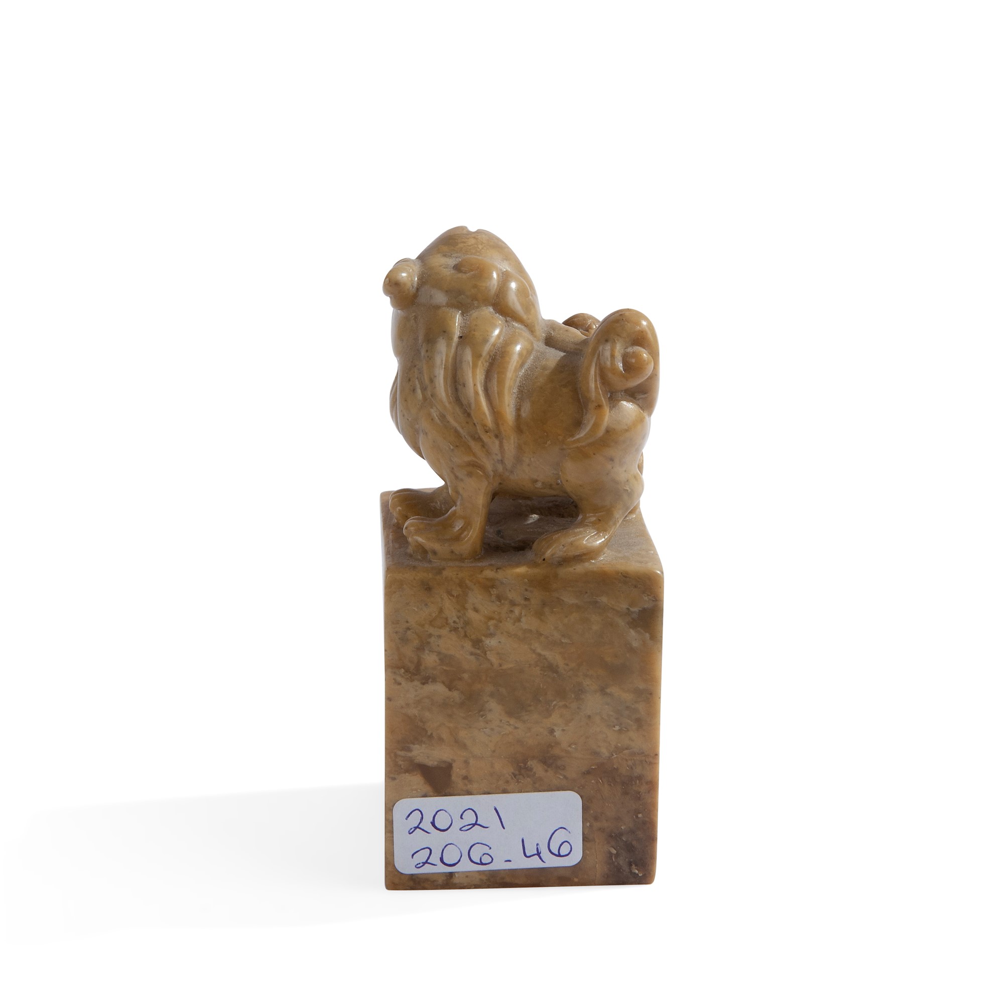 Sigillo in pietra dura, Cina, XX secolo sormontato da cane buddista con cucciolo; iscrizione sotto la base, cm 9x4x4