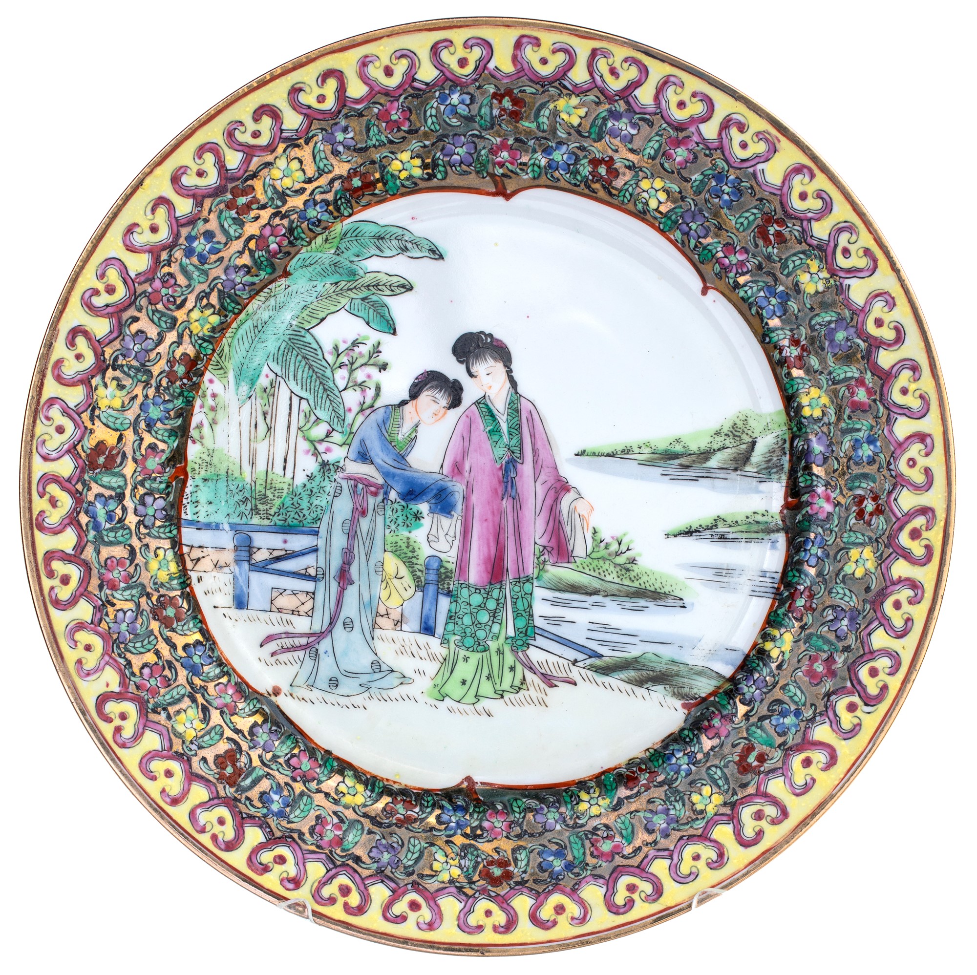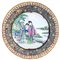 Piatto in porcellana policroma, Cina, XX secolo decorato da figure orientali ambientate in un paesaggio; testa con fitta decorazione su fondo rame, diametro cm 26