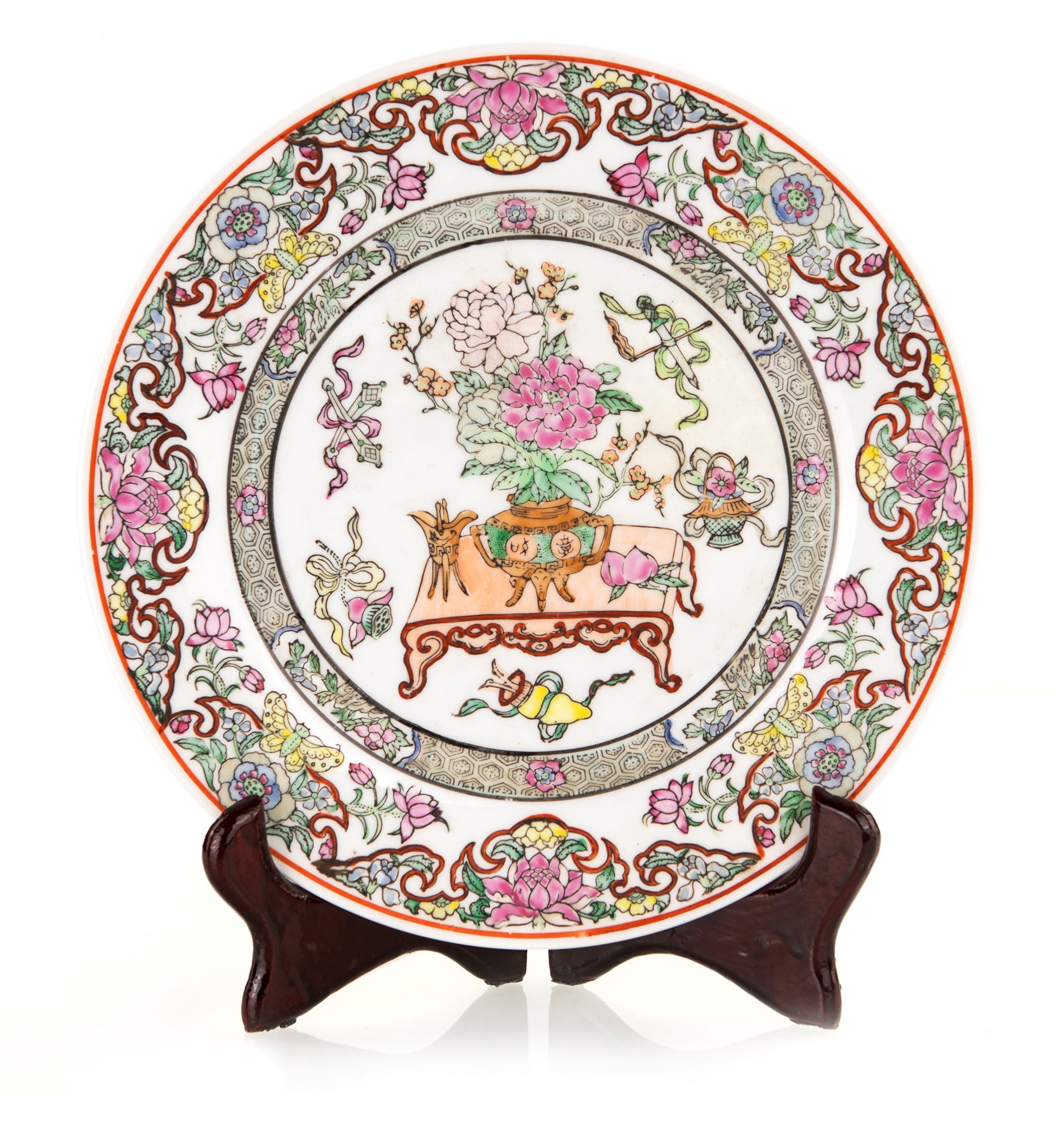Piatto in porcellana policroma, Cina, tarda dinastia Qing decorato al centro da un tavolo con vaso di peonie e simboli bene auguranti, diametro cm 25