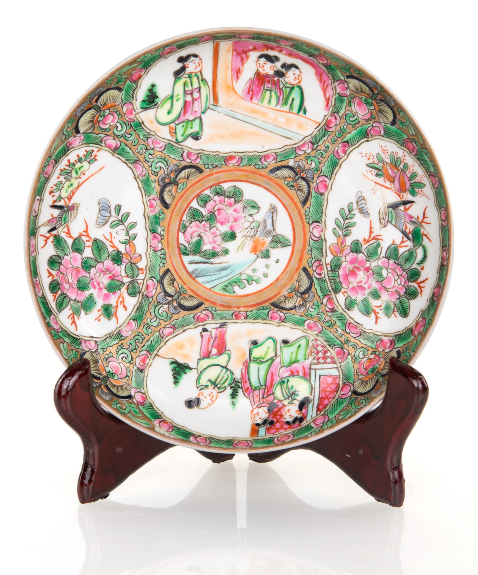 Piatto in porcellana policroma, Cina, inizi del XX secolo decorato da composizioni naturalistiche e figure di orientali entro riserve nei toni dominanti del rosa e del verde. Marca in rosso, diametro cm 19